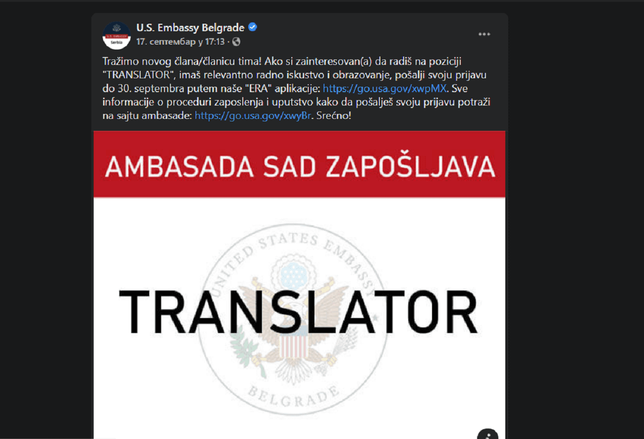 „Tražimo novog člana/članicu tima! Ako si zainteresovan(a) da radiš na poziciji „TRANSLATOR“, imaš relevantno radno iskustvo i obrazovanje, pošalji svoju prijavu do 30. septembra putem naše „ERA“ aplikacije. Sve informacije o proceduri zaposlenja i uputstvo kako da pošalješ svoju prijavu potraži na sajtu ambasade. Srećno!“, napisali su oni.