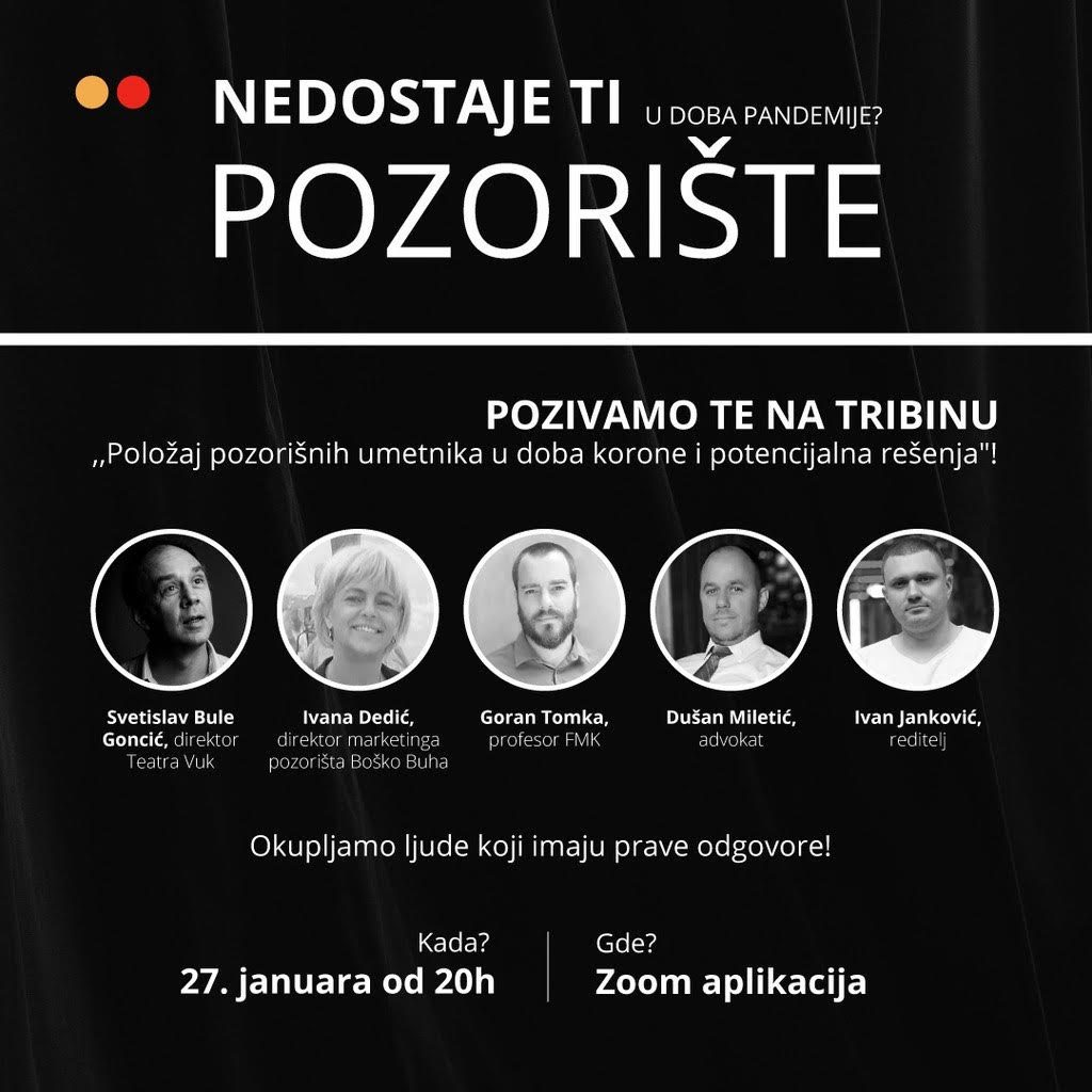 Online tribina pod nazivom „Položaj pozorišnih umetnika u doba korone i potencijalna rešenja“ u organizaciji mladih kreativaca okupljenih oko projekta PlayBox biće održana 27. januara sa početkom u 20h putem Zoom platforme.