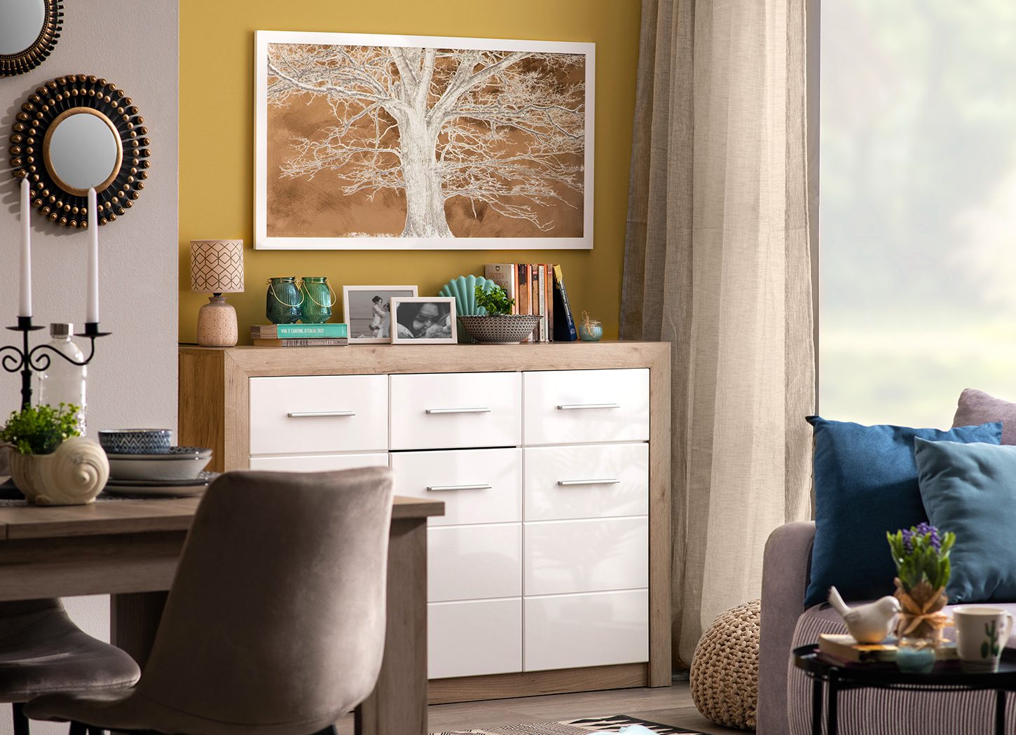 Ukoliko niste spremni da okrečite veliku površinu zida u žuto, možete se opredeliti za neki manji kutak. To će svakako dodatno osvežiti ambijent. Komoda ETNA 3K3F u dekoru sivog hrasta veoma je praktičan izbor za ambijent, a savršeno bi se uklopilo da manji zid iza nje okrečite u zemljano zlatno žutu nijansu. Na zid možete da okačite sliku DRVO koja će uneti dašak prirode.