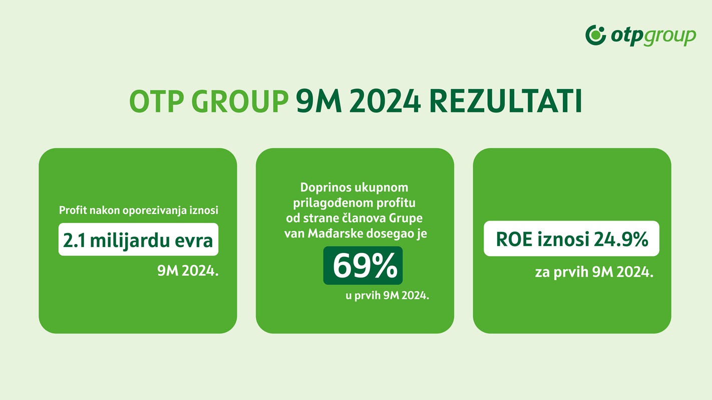 Kumulativni profit OTP Grupe nakon oporezivanja iznosio je 2,112 miliona evra u periodu od januara do septembra 2024. godine, s tim da je prinos na kapital dostigao 24.9%. Smanjenje dobiti nakon oporezivanja od 4% u odnosu na prethodnu godinu nastalo je zbog jednokratnog direktnog efekta od 425 miliona evra (nakon oporezivanja) uključivanja dve novostečene banke u bazni period; u 9M 2024. nije bilo stavki prilagođavanja na nivou Grupe.