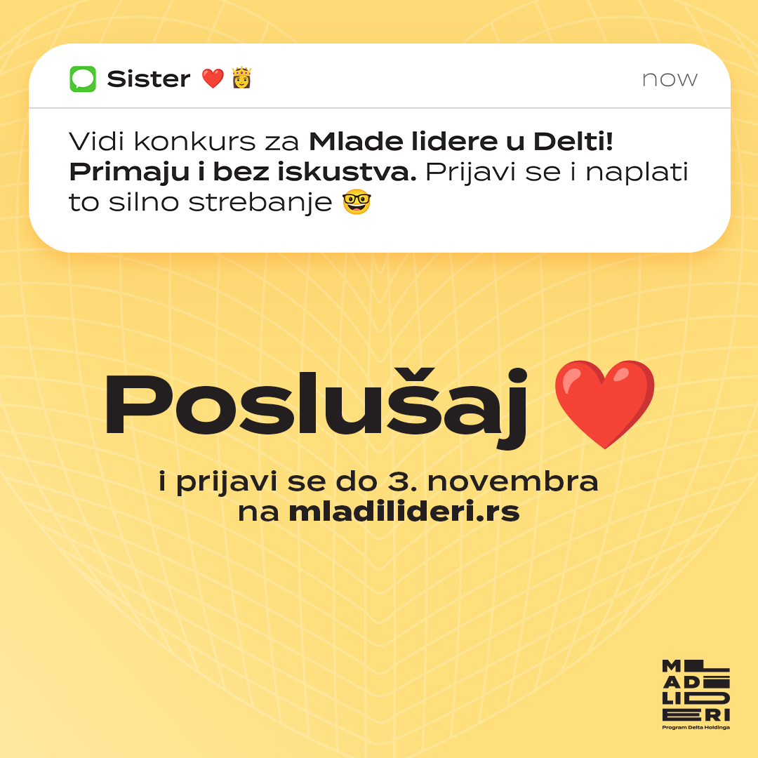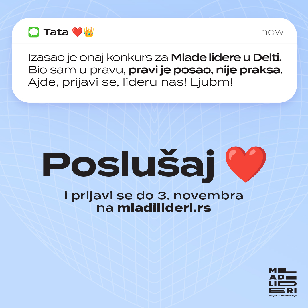 Oni koji nas najviše vole brinu o tome da ne propustimo prilike koje mogu oblikovati našu budućnost. I, baš kao što nas prijatelji i porodica podržavaju na svakom koraku, Delta Holding pruža mladima priliku da započnu karijeru kroz jedinstveni program Mladi lideri. Svi oni koji su se ikada zapitali kojim putem krenuti ili kako započeti profesionalni život treba da poslušaju svoje srce i prijave se na 13. konkurs programa Mladi lideri – jer dobre prilike su ovde u Srbiji.