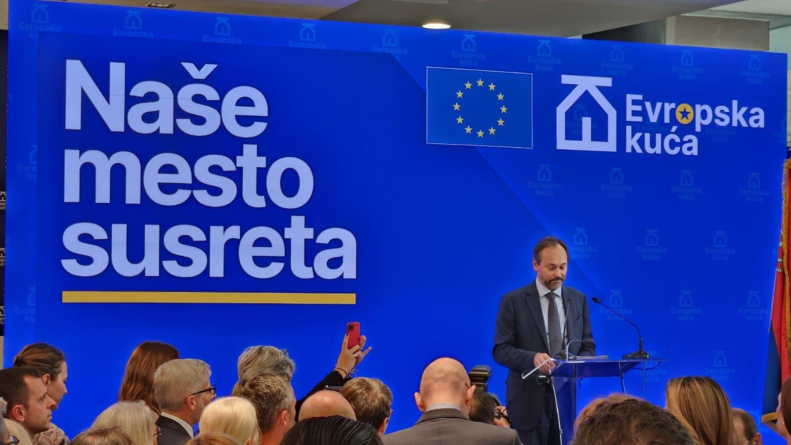 „Evropska kuća je naše mesto susreta za ljude, ideje i kulture, sve pod jednim evropskim krovom. Mesto koje pripada svima nama, gde možemo da slavimo naše sličnosti i razlike, u duhu međusobnog poštovanja i otvorenog uma. Hvala vam svima što ste došli danas, ovde su svi naši partneri iz civilnog društva, iz Vlade, iz poslovnog sektora, iz javne uprave, iz kulture. Ovo je upravo svrha Evropske kuće koju otvaramo danas“, poručio je ambasador Evropske unije u Srbiji Emanuele Žiofre.