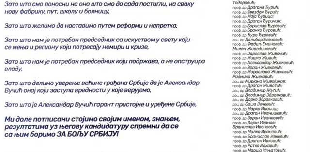 Oni su naveli da stoje uz kandidaturu Vučića, da žele da žive u stabilnoj državi, da žele pristojan život za svakog čoveka. Dodaju i da su umorni od vraćanja u prošlost, da žele državu koja je na evropskom putu i koja gradi mostove sa susedima.