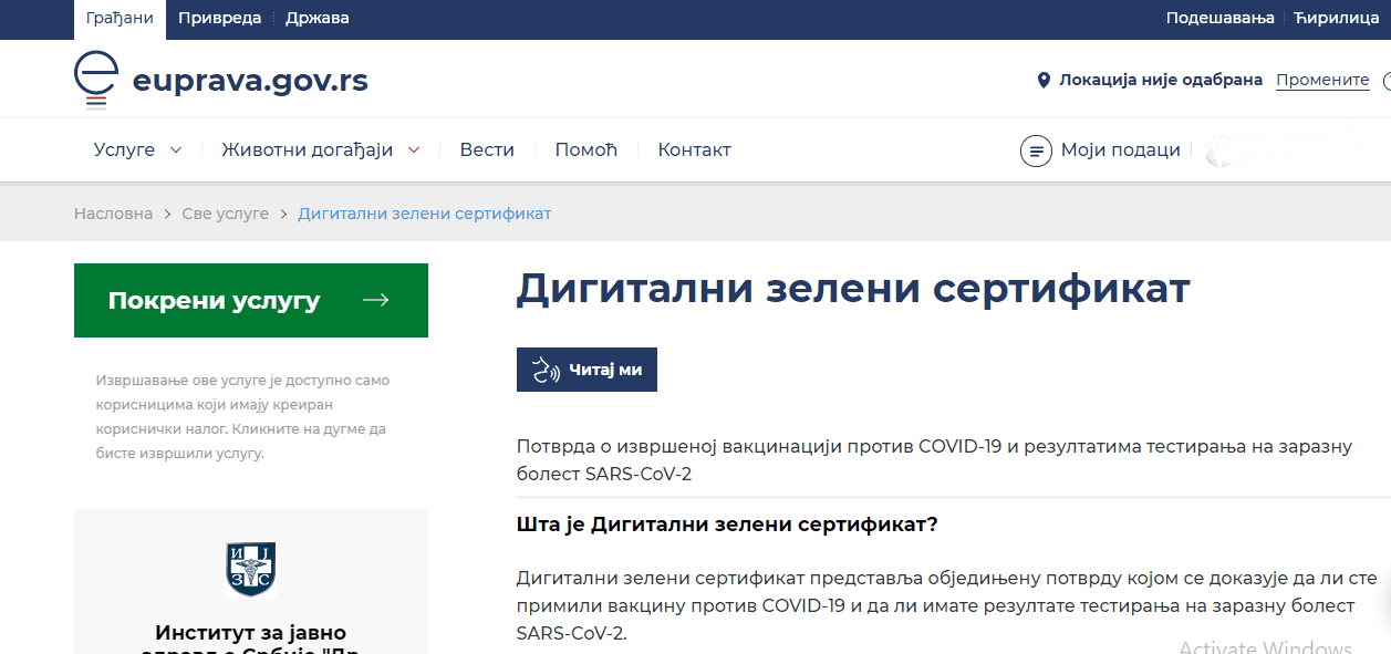 Nakon prijave i odabira usluge Digitalni zaleni sertifikat prikazuje se opcija Pokreni uslugu. Potrebno je da, nakon pokretanja opcije Pokreni uslugu, građani provere svoje podatke, potvrde imejl adresu i, kako se navodi, za par minuta Digitalni elektronski sertifikat stiže na odabrani imejl.