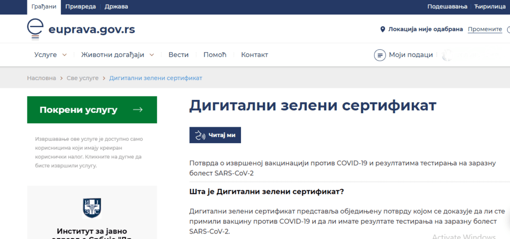 Građanima Srbije od juče je dostupna objedinjena digitalna potvrda o izvršenoj vakcinaciji protiv korone i rezultatima različitih testiranja na zaraznu bolest SARS-CoV-2. Pored ličnih podataka – imena, prezimena, JMBG-a, pola i broja pasoša, sertifikat sadrži i podatke da li je lice vakcinisano, broj primljenih doza, kao i datum primanja prve i druge doze. Jedan od … Nastavi sa čitanjem Ovo je DIGITALNI SERTIFIKAT – kako do njega? (FOTO)