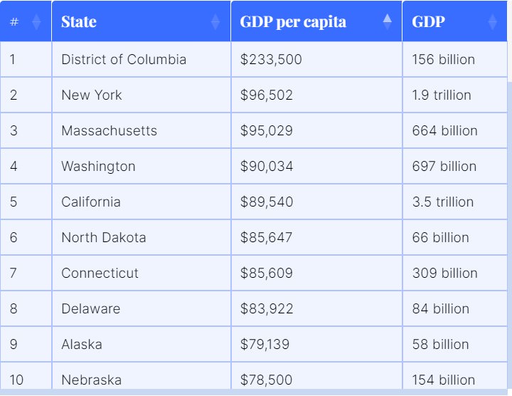 Sledeća tabela pokazuje 10 najbogatijih država u Americi na osnovu BDP-a po glavi stanovnika.
