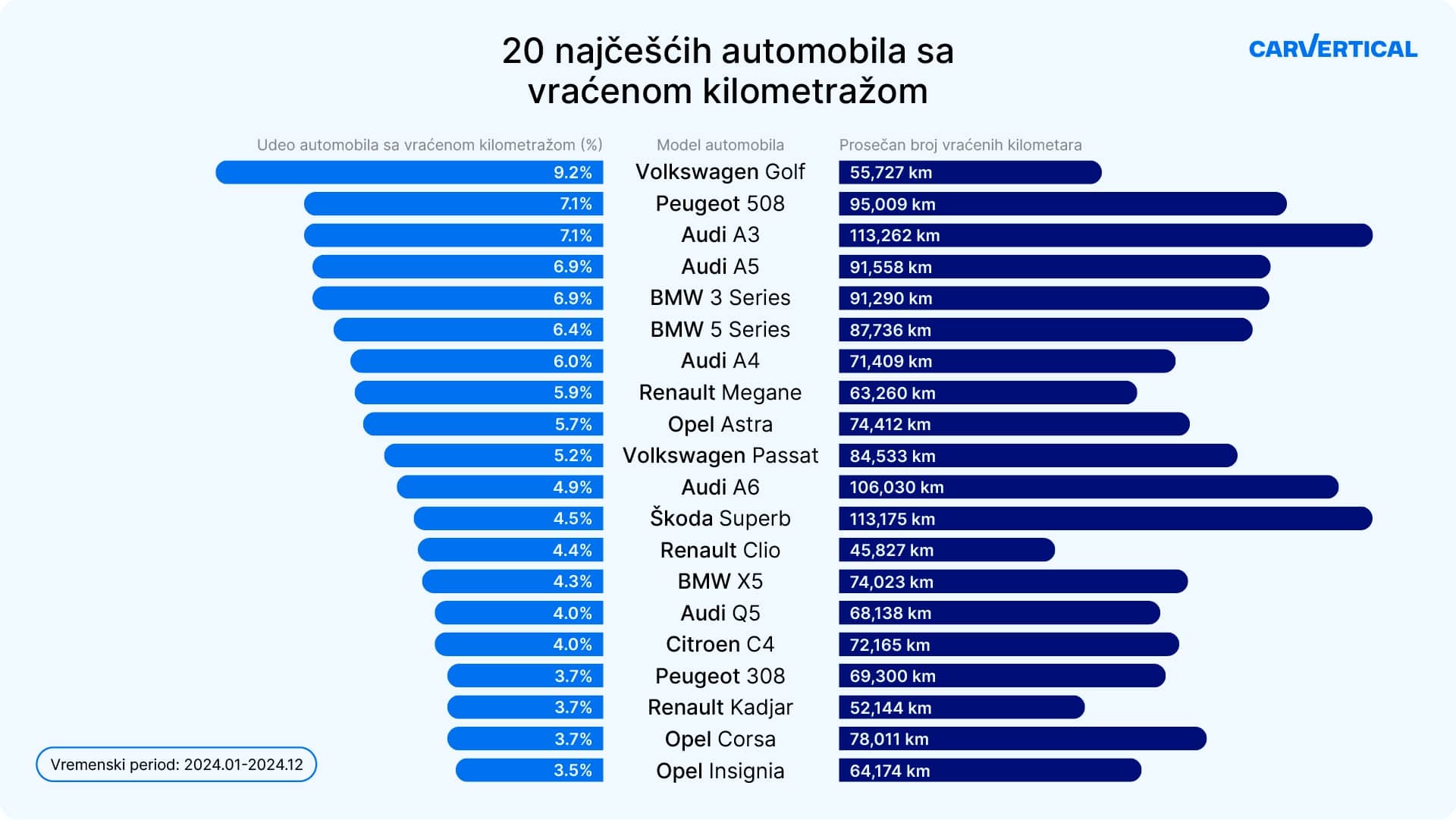 Modeli sa najčešće vraćenom kilometražom su Audi A3 (113.000 km), Škoda Superb (113.000 km) i Audi A6 (106.000 km). Ako oglas navodi da vozilo ima 100.000 pređenih kilometara, stvarna brojka može biti i dvostruko veća.