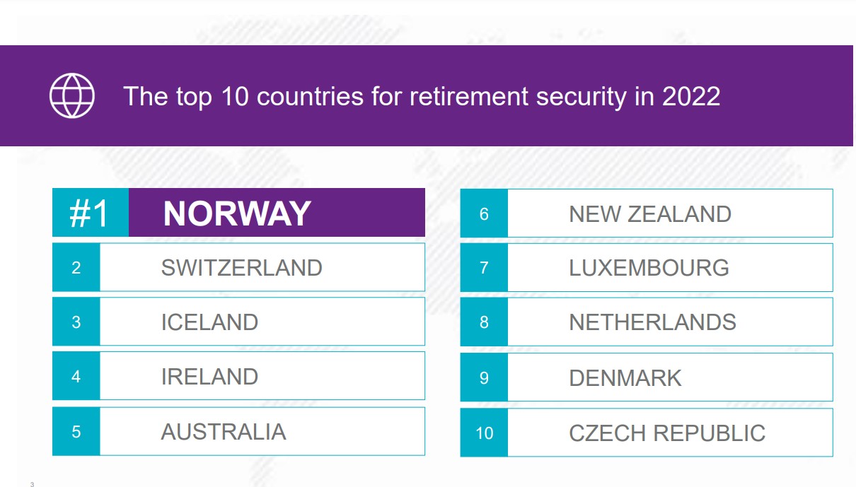 Izgleda da je najugodniji penzionerski život rezerviran za Norvešku, koja ponosno zauzima prvo mesto. Slede je Švajcarska, Island i Irska. Na petom i šestom mestu smestile su se Australija i Novi Zeland.