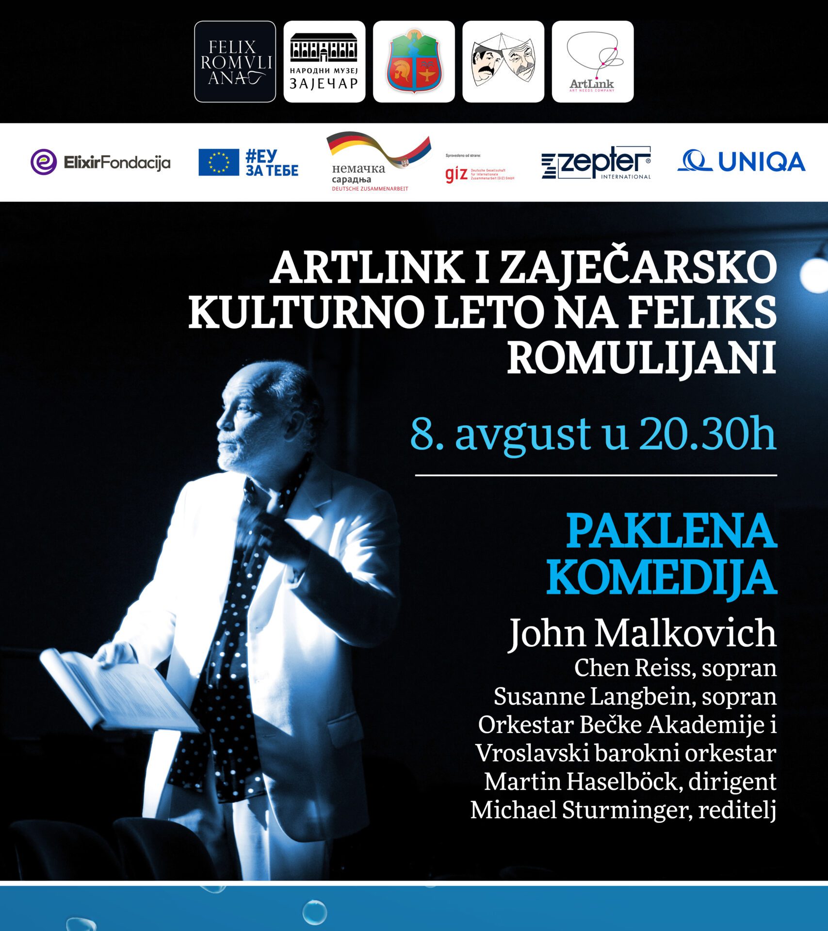 Posle koncerata za sećanje eminentnih svetskih muzičarana na Feliks Romuliani na Zaječarskom kulturnom letu, ove godine jubilarni 10. ArtLink Festival i partneri iz Zaječara predstavljaju Paklenu komediju u izvođenju Džona Malkovicha, orkestra Bečke akademije i Vroclavskog baroknog orkestra sa dirigentom Martinom Haselbekom, sopranima Čen Reiz, Suzan Langbain i reditelj je Mihael Šturminger.