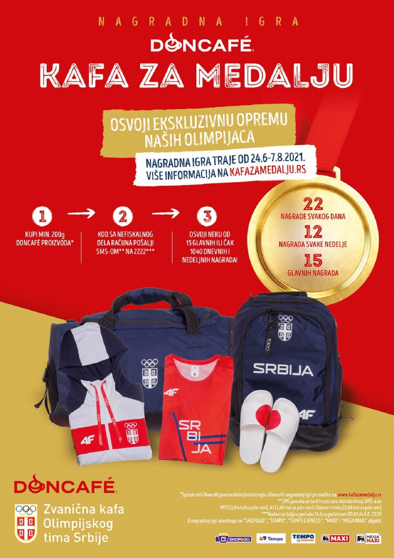 Pravo na učešće ostvaruje svaki kupac kupovinom minimum 200g Doncafé proizvoda na jednom fiskalnom računu, u bilo kom Shop&Go, Tempo, Tempo Express, Maxi i Mega Maxi objektu.