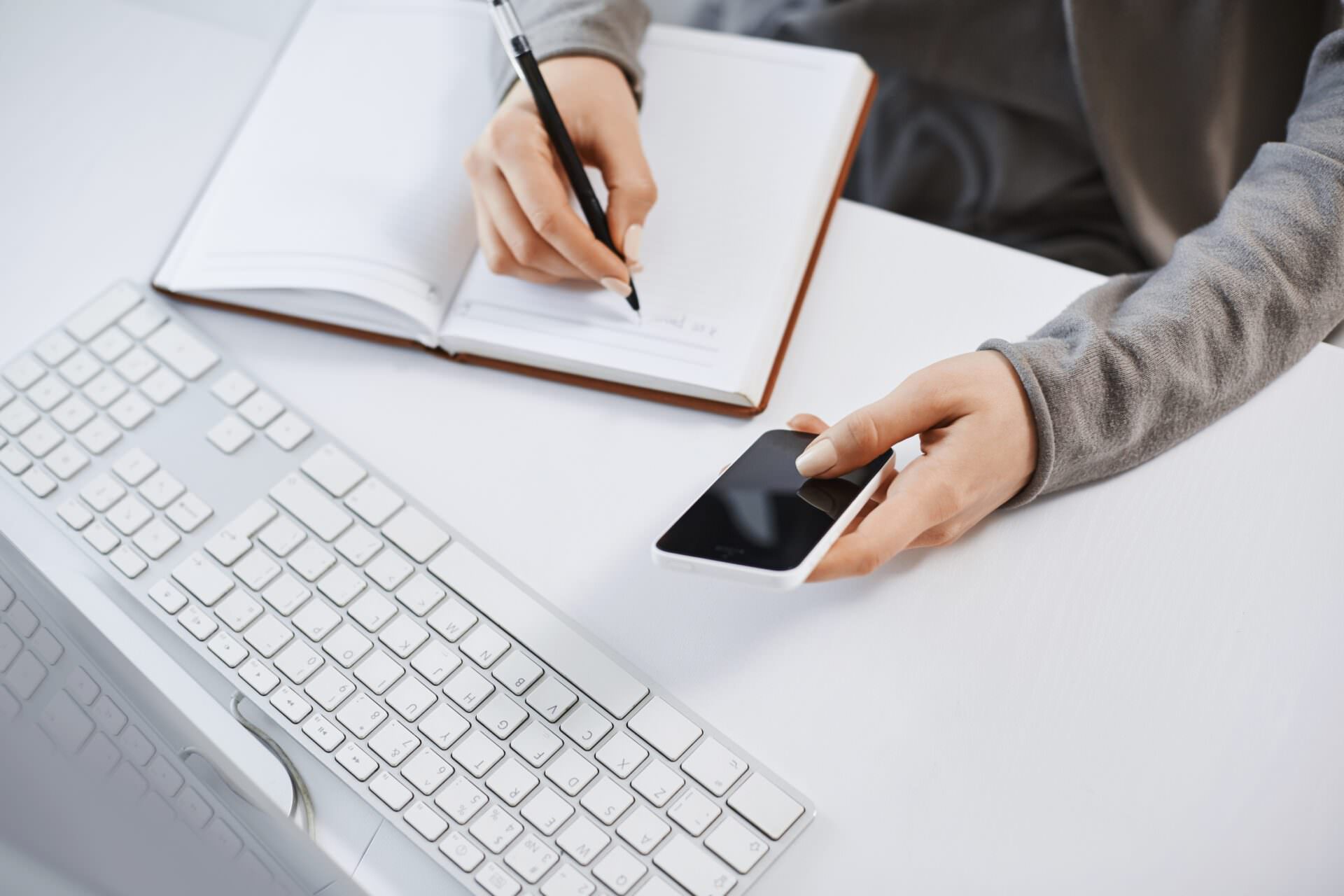 High angle shot of woman hands working with gadgets. Cropped shot of modern female holding smartphone while writing plan in notebook, sitting near keyboard and computer, having tough time at office.
