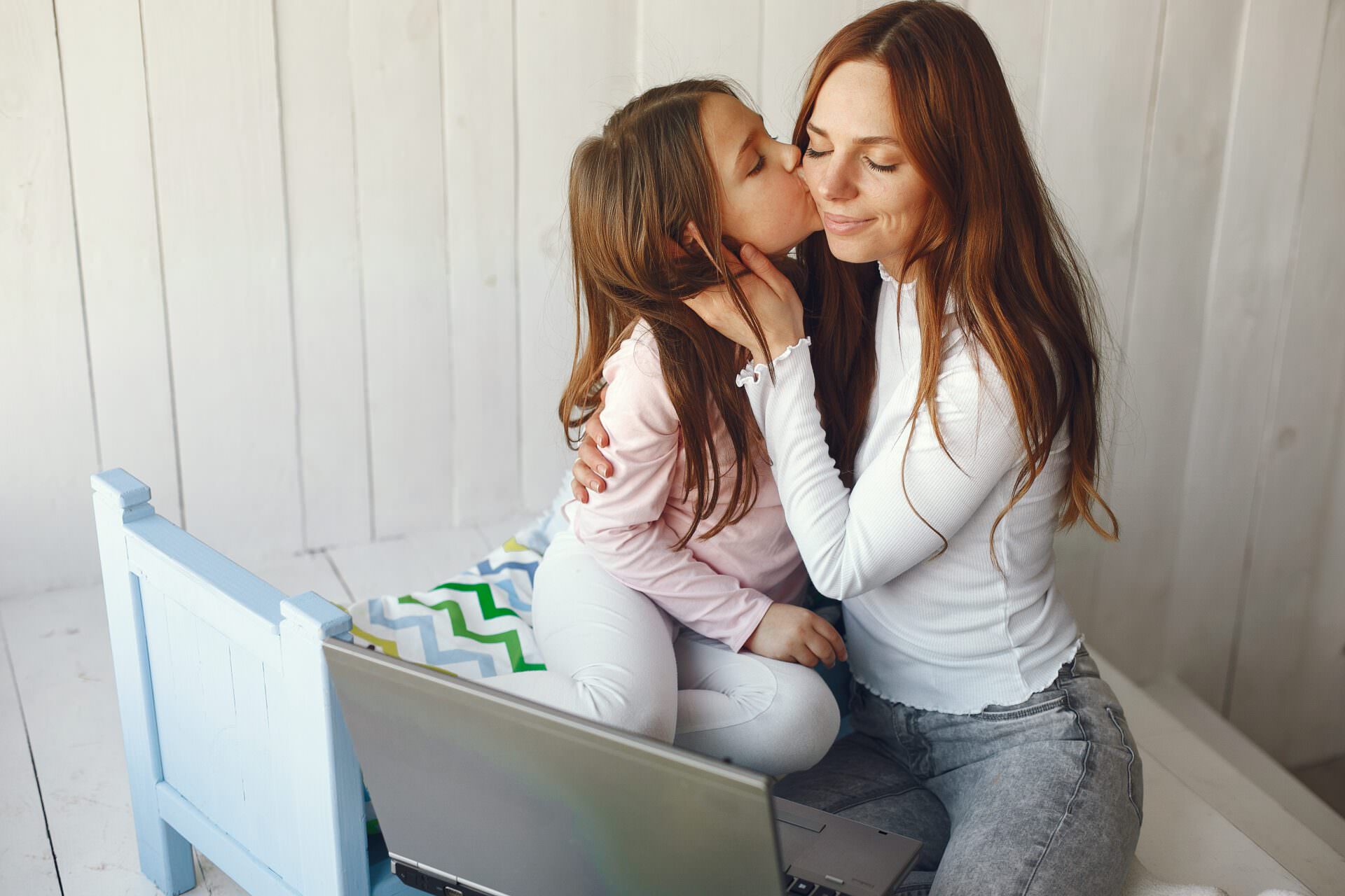 Little girl looking at laptop with her mother. Woman in a white sweater. Enjoying spending time together.