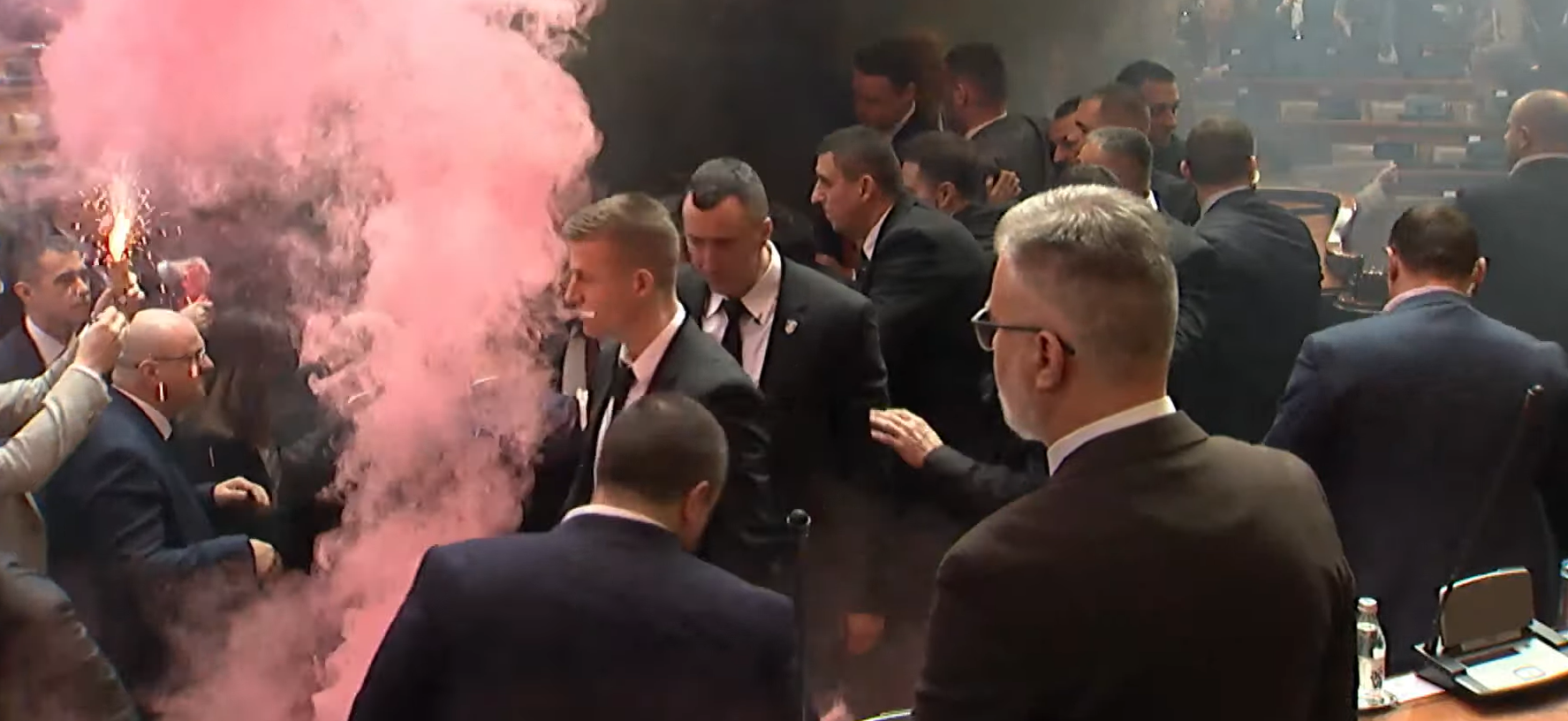 U saopštenju se navodi i da je „naloženo da se utvrdi identitet lica koja su bacala različite predmete i time nanela povrede narodnim poslanicima“.