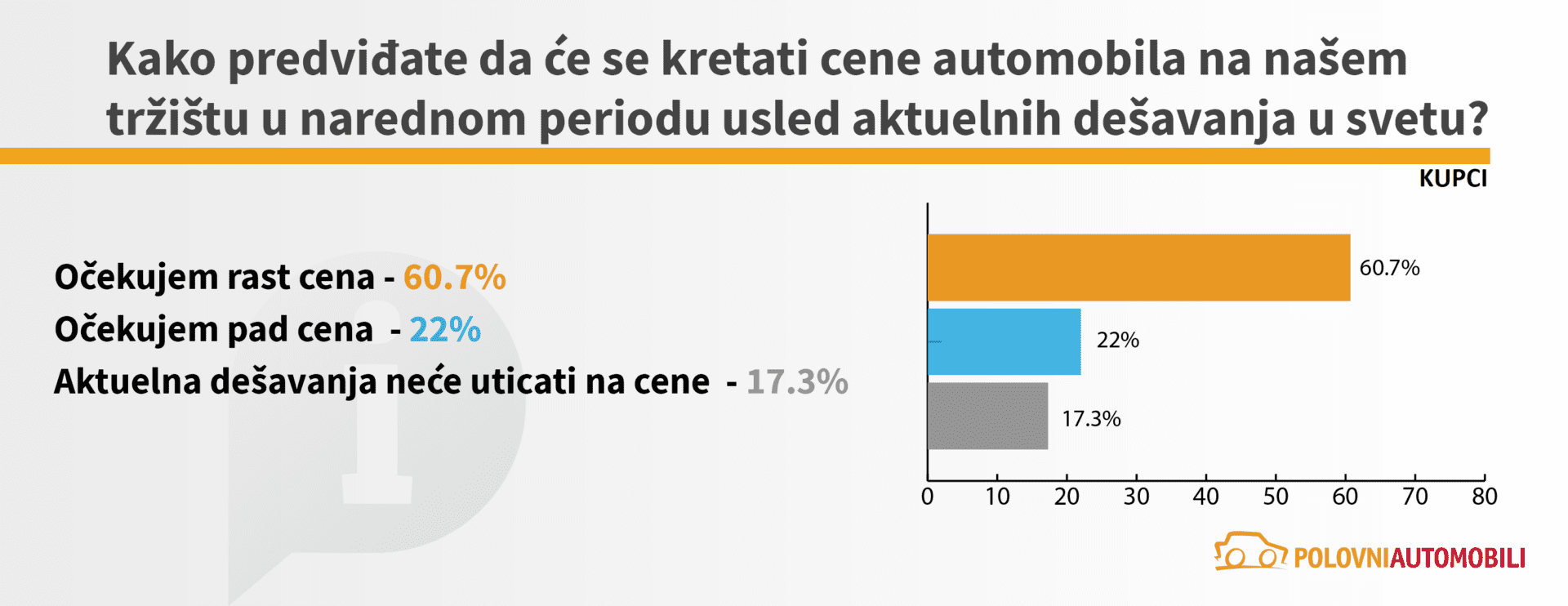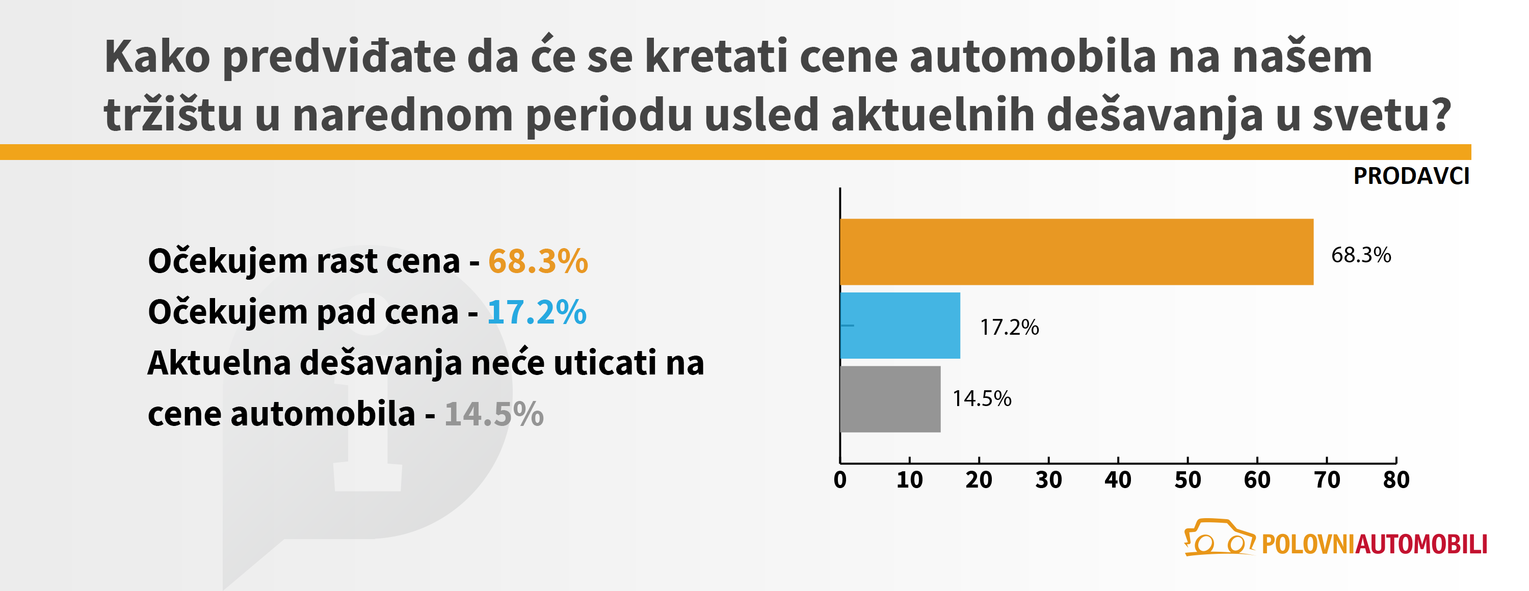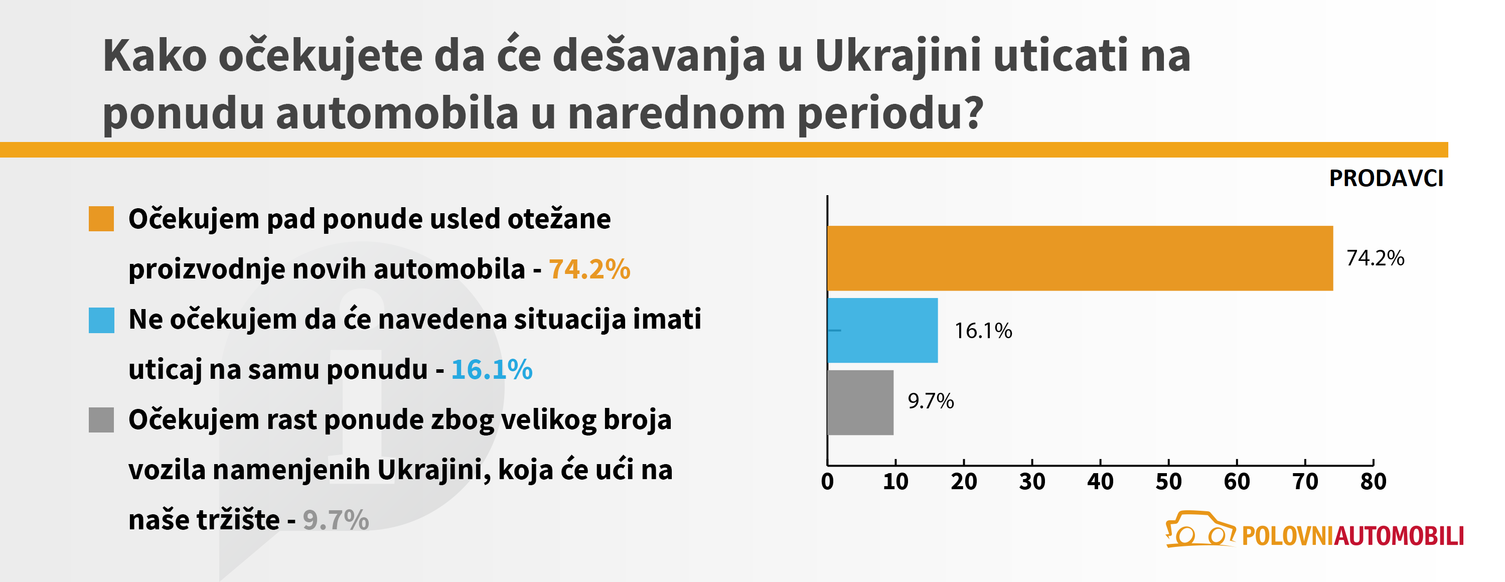 Sa ciljem da utvrdi kakvi su efekti geopolitičkih dešavanja u svetu na tržište automobila u Srbiji, sajt Polovni automobili sproveo je anketu kojom je obuhvaćeno 8436 korisnika, odnosno potencijalnih kupaca i 186 trgovaca automobilima. Pored toga, realizovana je i detaljna analiza stanja na tržištu u prva četiri meseca tekuće godine. Ona sadrži analizu prodaje polovnih automobila, kao i analizu kretanja prosečnih cena automobila oglašenih na sajtu.