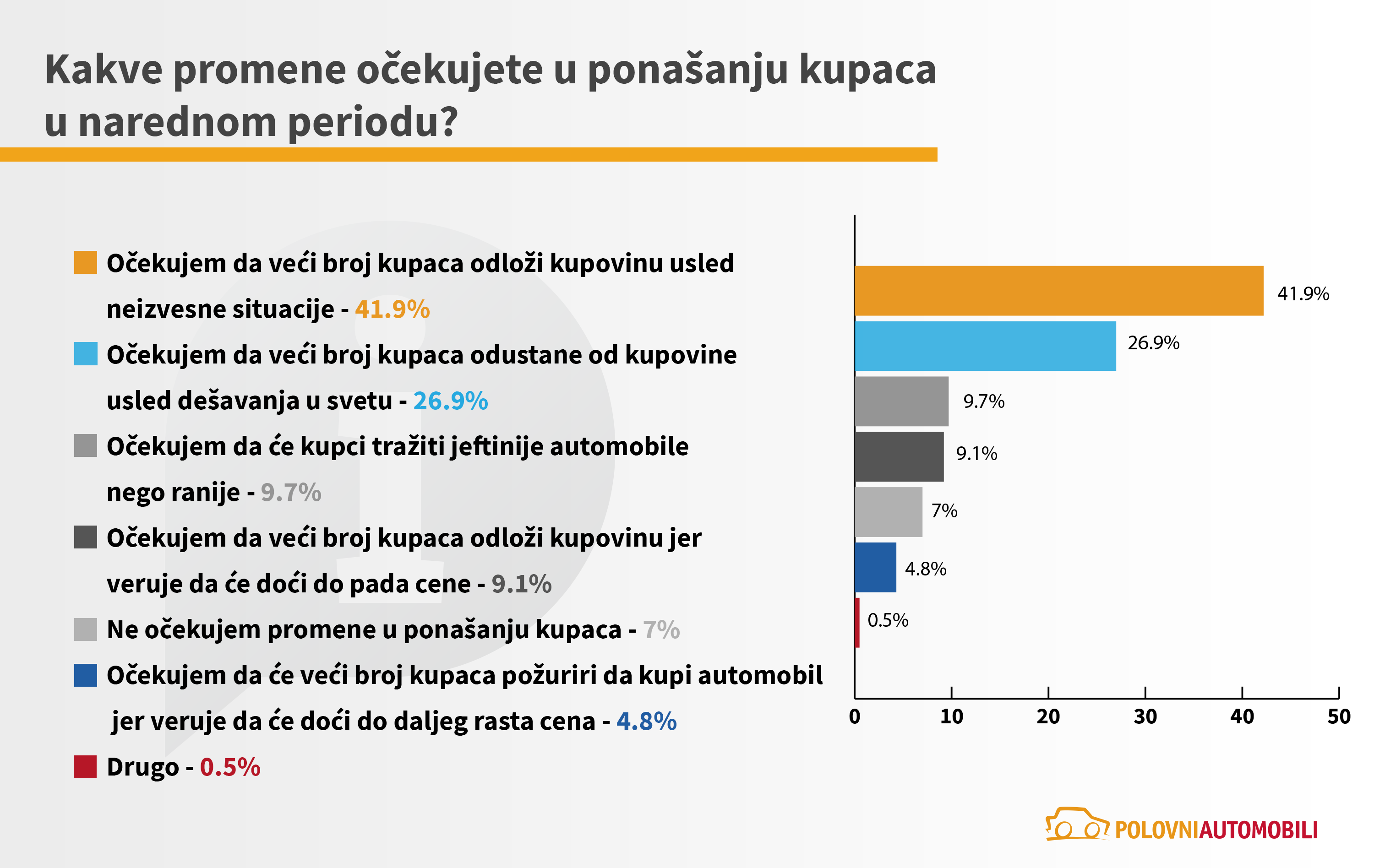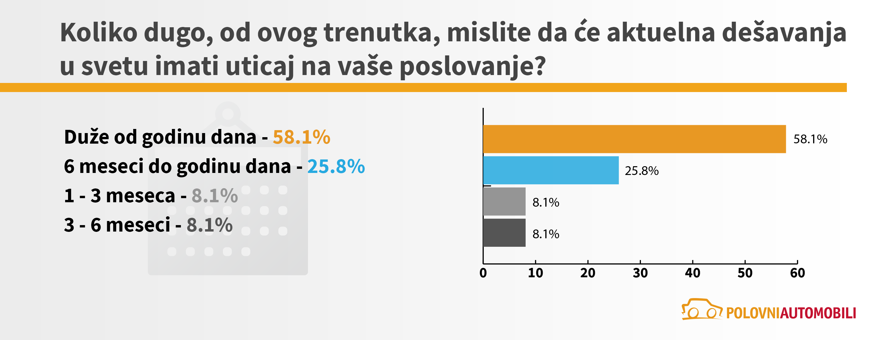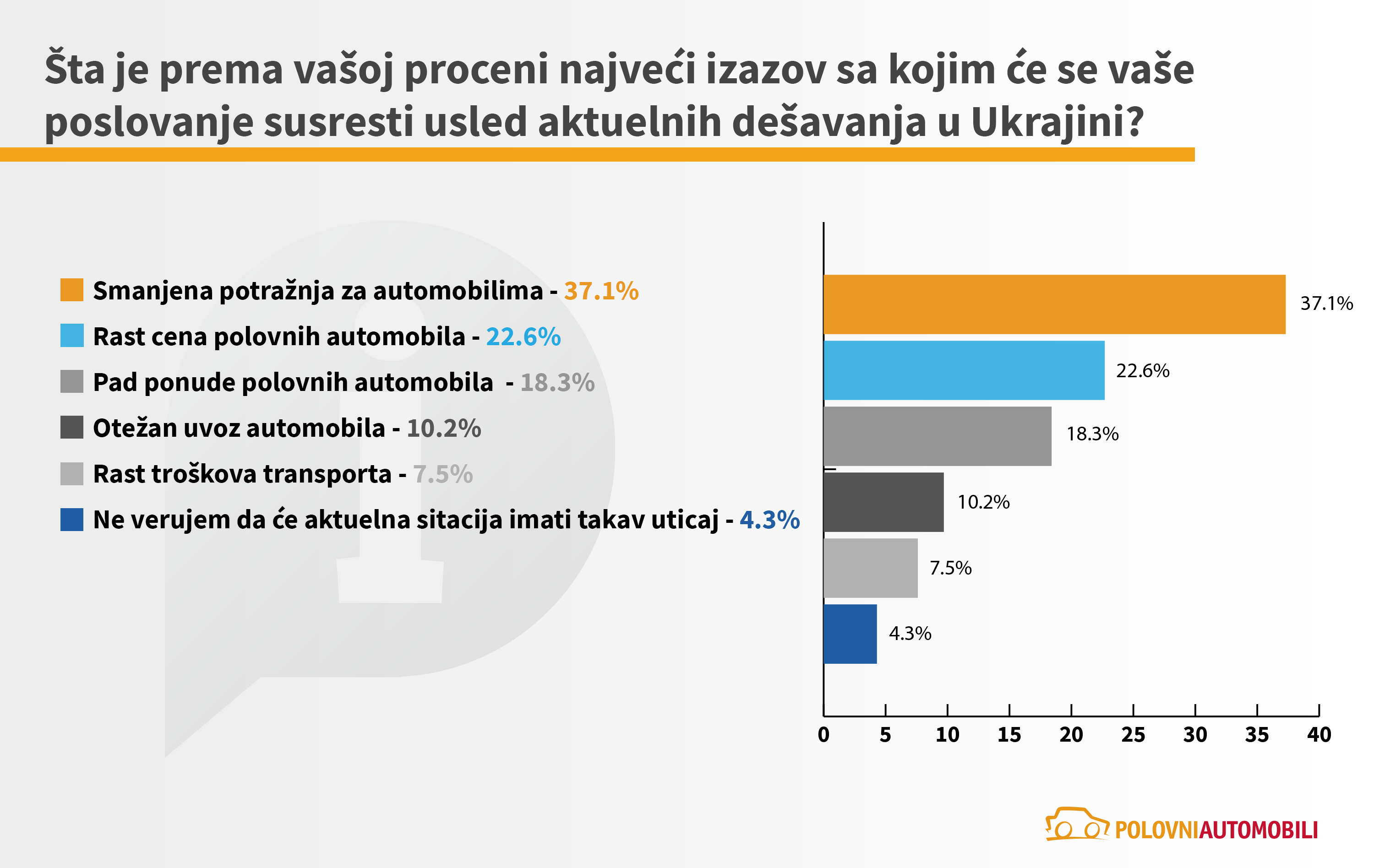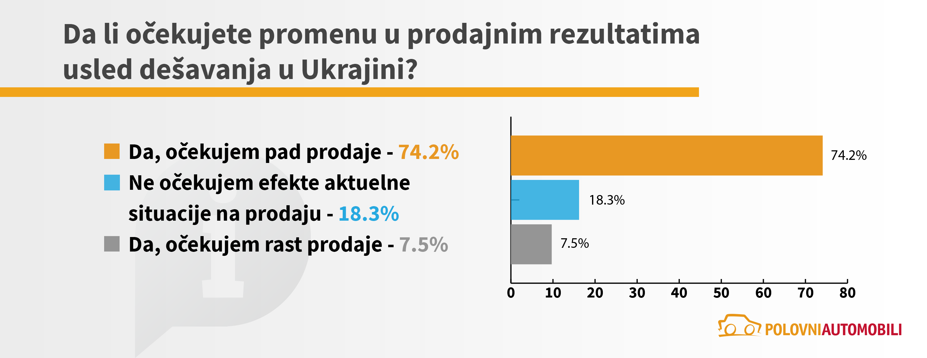 Sa ciljem da utvrdi kakvi su efekti geopolitičkih dešavanja u svetu na tržište automobila u Srbiji, sajt Polovni automobili sproveo je anketu kojom je obuhvaćeno 8436 korisnika, odnosno potencijalnih kupaca i 186 trgovaca automobilima. Pored toga, realizovana je i detaljna analiza stanja na tržištu u prva četiri meseca tekuće godine. Ona sadrži analizu prodaje polovnih automobila, kao i analizu kretanja prosečnih cena automobila oglašenih na sajtu.