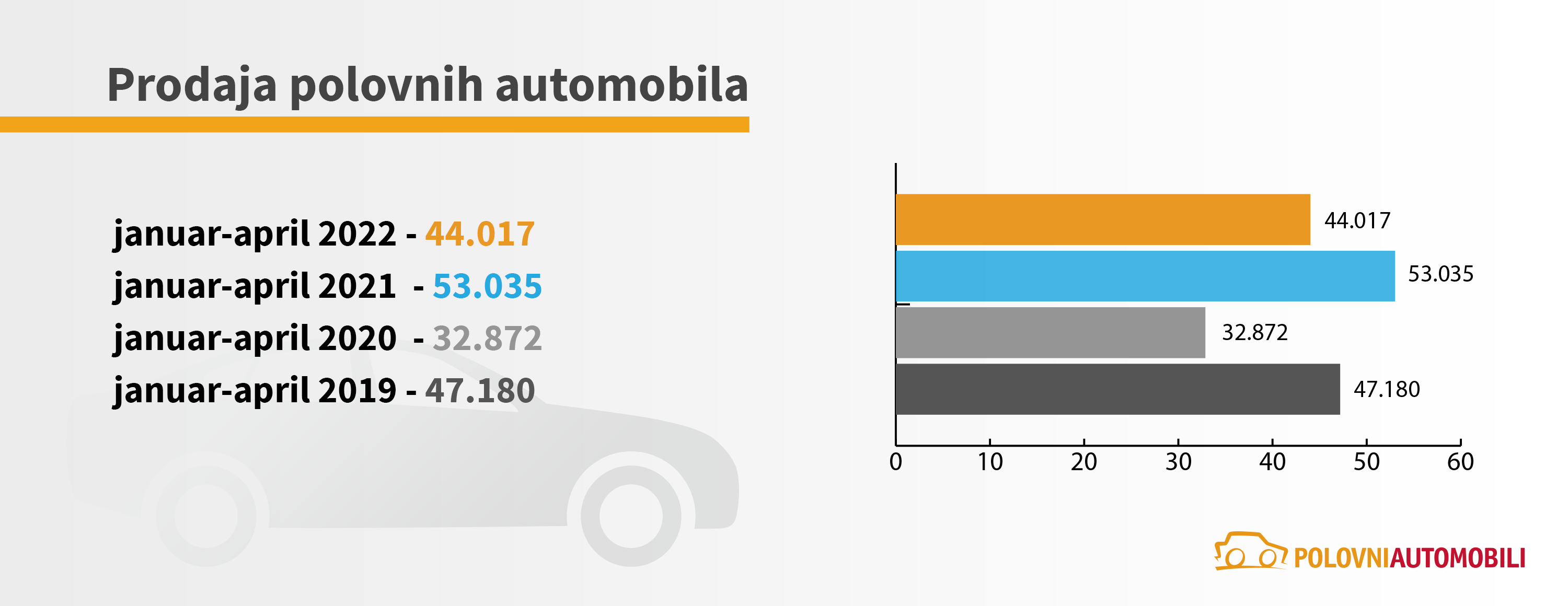 Poređenja radi, prodaja polovnih automobila u prvom tercijalu tekuće godine nadmašila je prodaju iz 2020. godine za čak 34%. To je donekle i očekivano s obzirom da je tada bilo na snazi vanredno stanje. Zbog toga su ovogodišnji rezultati upoređeni i sa prva četiri meseca 2019. godine, kada je prodaja polovnjaka bila svega 6% veća nego tekuće godine.