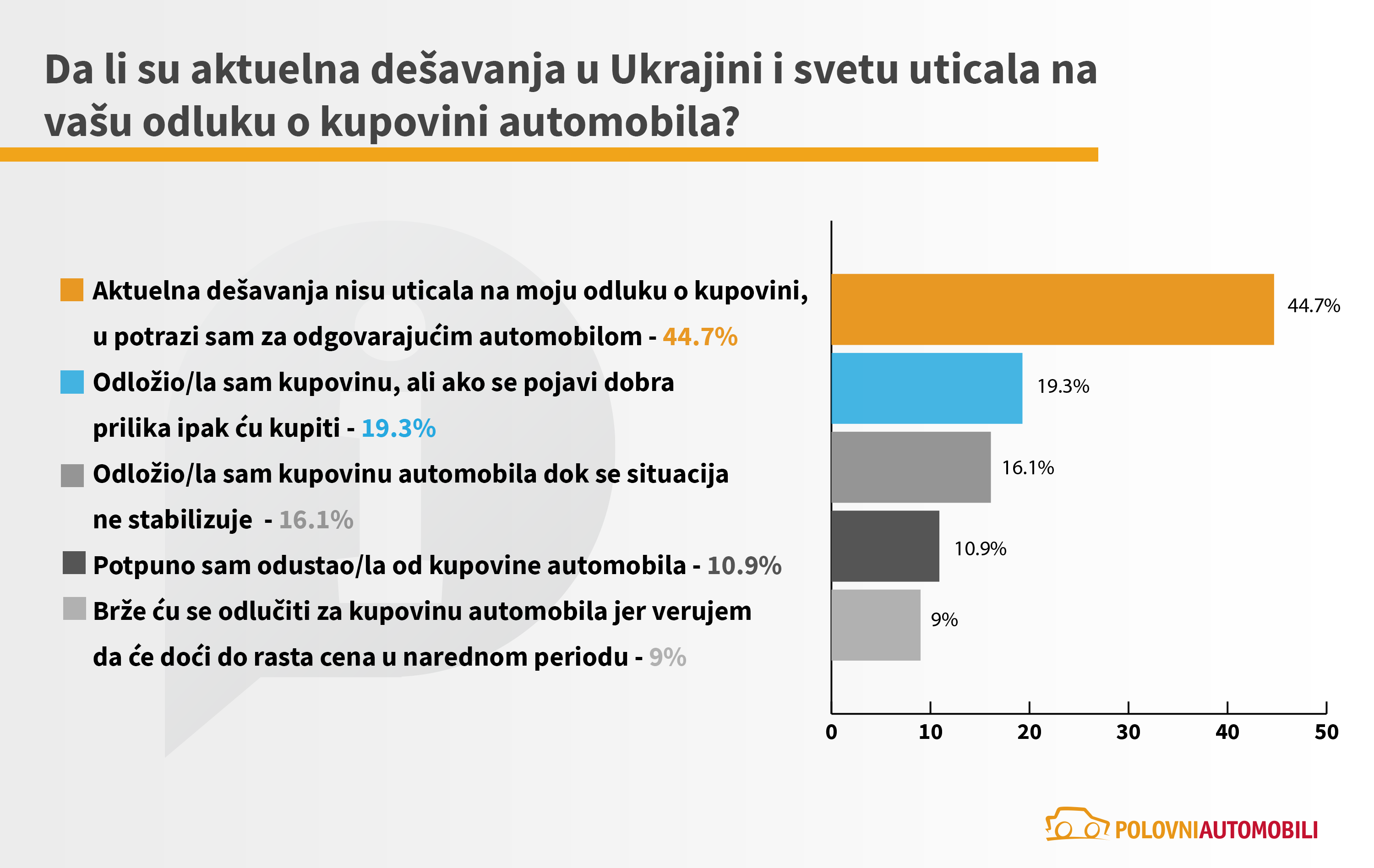 U okviru sprovedene ankete sajt Polovni automobili pitao je i kupce da li su aktuelna dešavanja u Ukrajini i svetu uticala na njihovu odluku u kupovini, a njihovi odgovori se donekle razlikuju od navedenih očekivanja prodavaca.