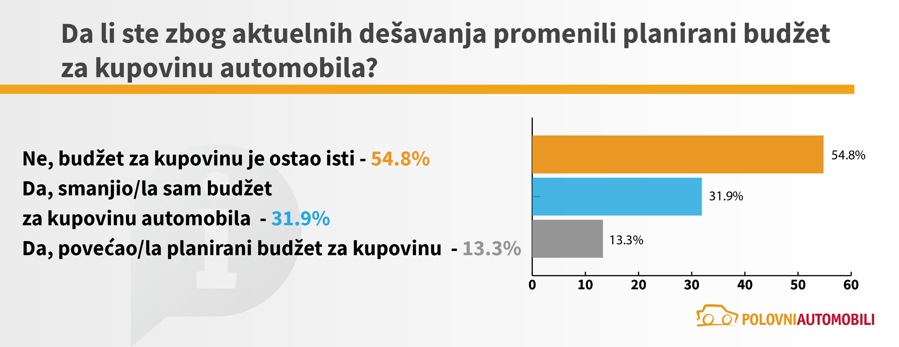 Kada je reč o budžetu namenjenom za kupovinu automobila, više od polovine kupaca obuhvaćenih anketom (54,8%) navodi da nisu menjali njegov iznos. Čak 31,9% kupaca je smanjilo budžet uprkos rastu cena, a svega 13% je povećalo iznos koji su spremni da izdvoje za kupovinu novog četvorotočkaša.