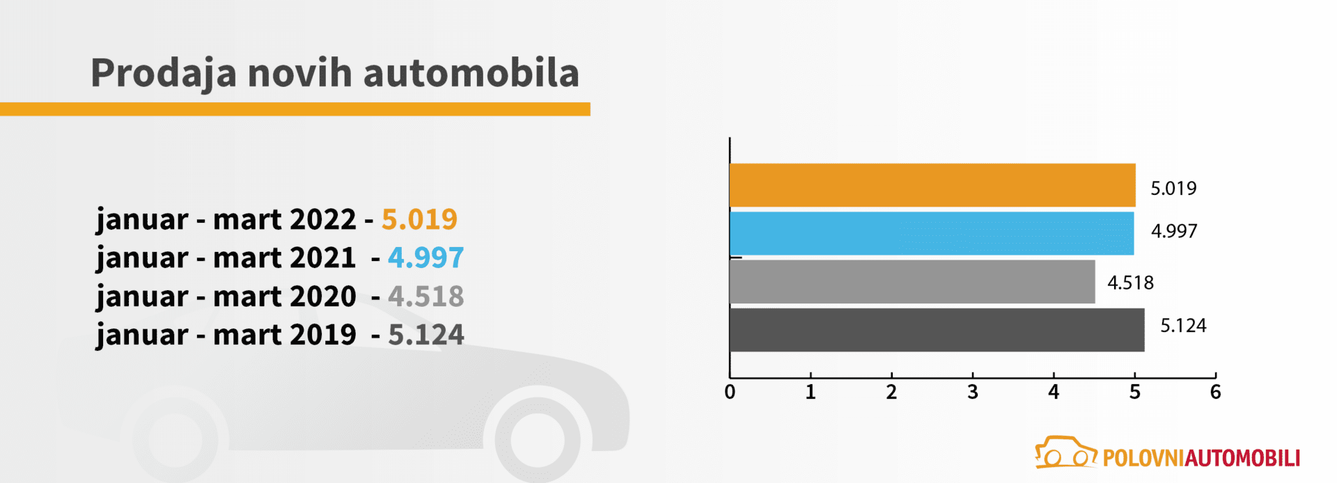 Prema analizi koju je sproveo sajt Polovni automobili na osnovu podataka prikupljenih u saradnji sa „CUBE Team“-om, u prvom kvartalu tekuće godine prodato je 5.019 novih automobila, približno isto kao u posmatranom periodu prethodne godine, kada je ovaj podatak iznosio 4.997. Kada ovakve rezultate uporedimo sa prvim kvartalom 2020. godine primetan je rast prodaje u tekućoj godini od 11%. Navedeni podaci nedvosmisleno ukazuju na oporavak tržišta novih automobila od inicijalnog udara pandemije. Ipak, veoma je značajno imati u vidu i podatke iz 2019. godine, kada tržište još uvek nije bilo izmenjeno, te na osnovu takvog poređenja može dobiti realnija slika stanja. Prodaja novih vozila u prvom kvartalu tekuće godine je za svega 2% manja u odnosu na isti period 2019. godine, te možemo zaključiti da su ovakvi rezultati gotovo dostigli one iz perioda pre pandemije.