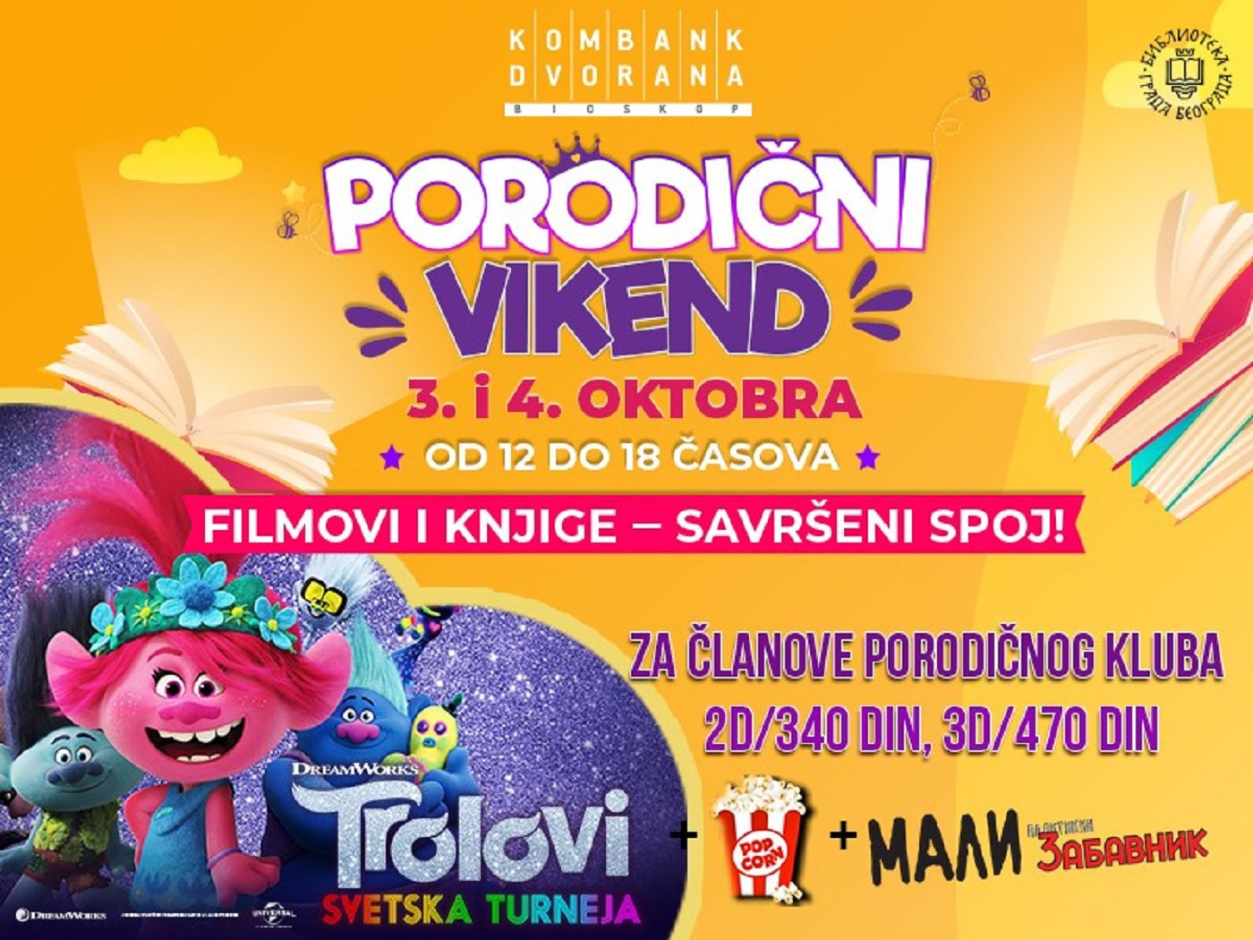 Posle šest meseci pauze u radu bioskopa, nastale usled pandemijske krize, klinci i klinceze će imati prilike da prvi put od ponovnog otvaranja bioskopskih sala, sa svojim roditeljima ili u društvu svoje „ekipe“ uživaju u tradicionalnom Porodičnom vikendu od 12 do 18h pod sloganom FILMOVI I KNJIGE – SAVRŠEN SPOJ.
