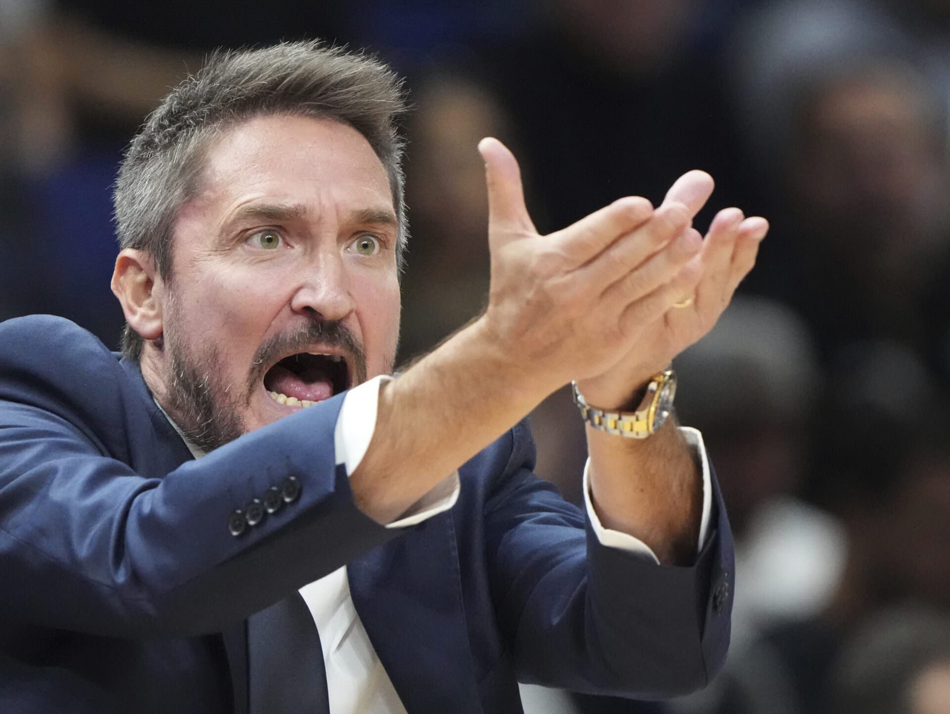 Italy’s head coach Gianmarco Pozzecco reacts on the sidelines during the Eurobasket 2022 basketball tournament knockout round of 16 match between Serbia and Italy in Berlin, Germany, Sunday, Sept. 11, 2022. (Soeren Stache/dpa via AP)