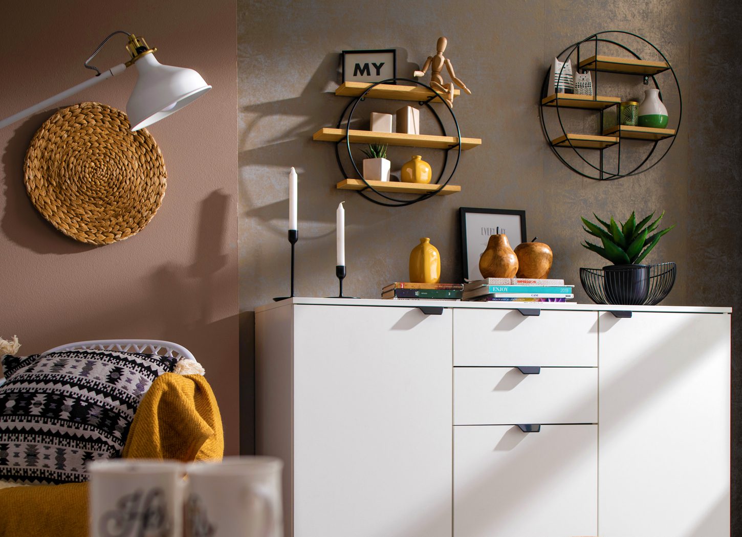 Možete kombinovati i dve manje police, npr. zidnu policu VKS-80027M i zidnu policu VKS-80029M, ili zidnu policu VKS-80053 sa zidnom policom VKS-80054. Najbolje je da ih postavite dijagonalno, pojačavajući tako dinamiku prostora. Ukoliko želite još dinamičniji ambijent, savet je da se drvo dekor polica kombinuje sa nameštajem u beloj boji, pa tako iznad bele komode DUERO 3K2F stavite zidnu policu VKS-80043 i zidnu policu VKS-80049.