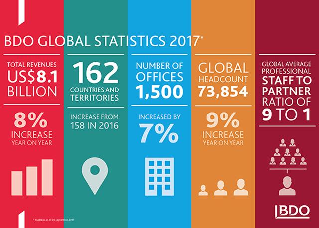 BDO objavljuje da ukupan kombinovani prihod od naknada (uključujući i samostalne firme koje su članice ekskluzivnog saveza BDO Alliance) za godinu koja se završava 30. septembra 2017. godine u iznosi 8,1 milijardi dolara tj. 7,4 milijardi EUR, što predstavlja godišnji rast od 8%, po stalnim deviznim kursevima.