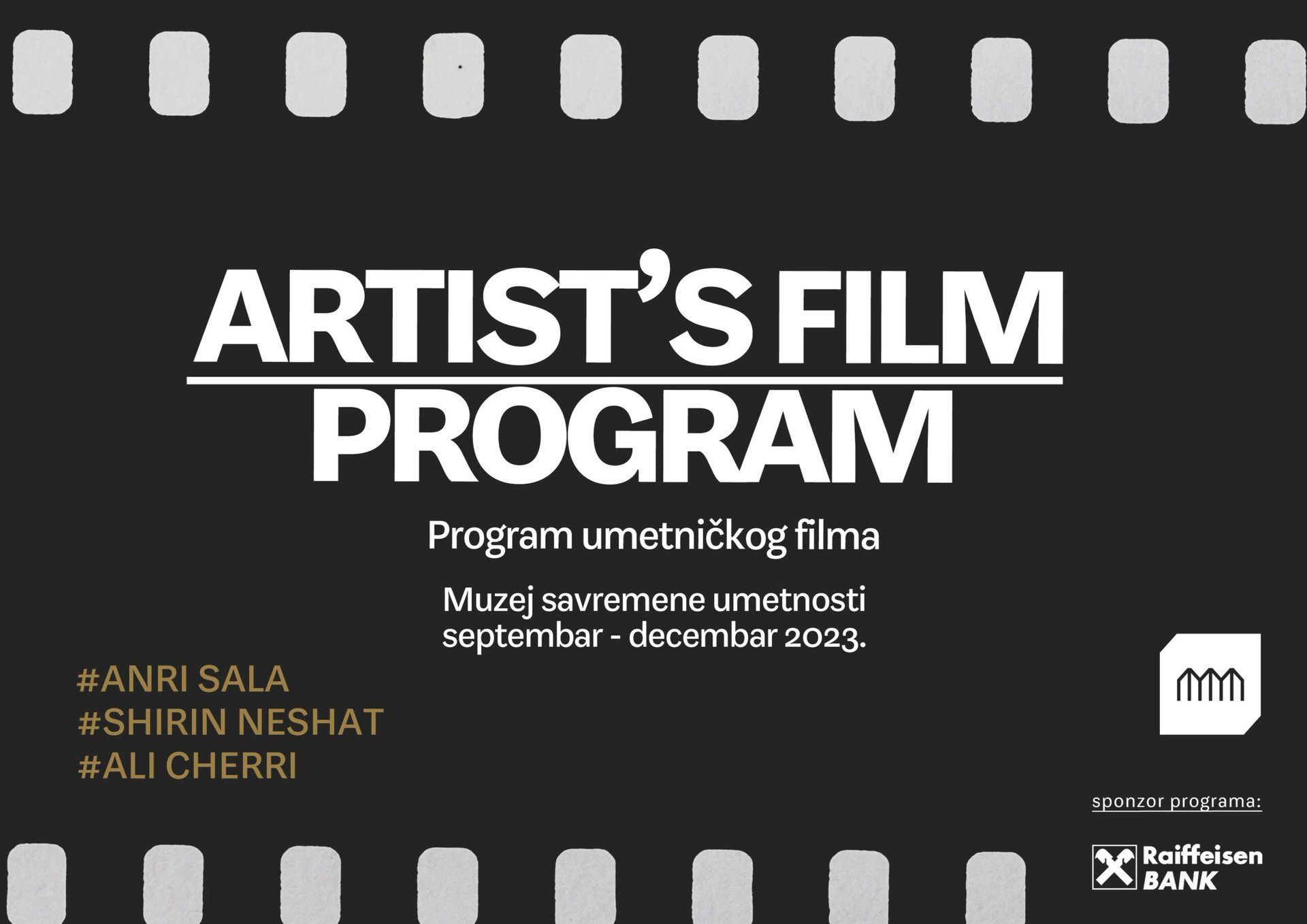 U ovogodišnjem prvom izdanju programa umetničkog filma MSUB ima zadovoljstvo i čast da predstavi izbor filmova umetnika koji su u dosadašnjoj praksi stekli najviša svetska priznanja i slavu u oblasti filma. Umetnici ovogodišnjeg filmskog programa u MSUB su Anri Sala, Širin Nešat i Ali Čeri.
