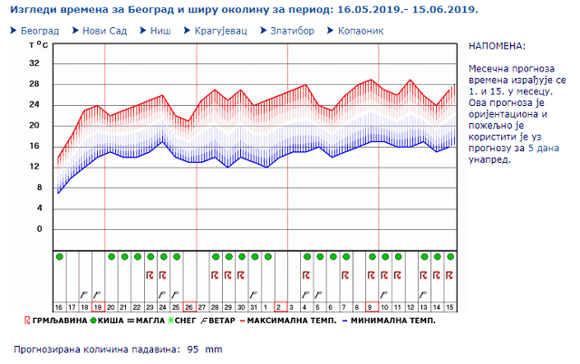 Kišno vreme se prognozira od 20. do 26. maja, zatim od 28. maja do 2. juna, pa odmah od 4. do 8. juna, dok bi od 9. do 15. juna bio samo jedan sunčan dan.