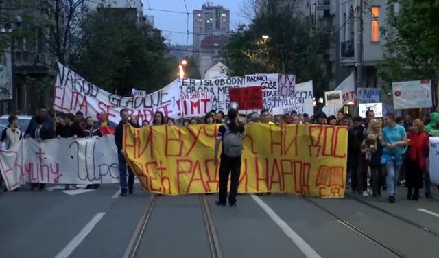 Tokom šetnje od Trga Slavija do Krunske ulice nije bilo ulične rasvete. Demonstrantima su se pridružili i radnici fabrike IMT iz Rakovice, koja je od 2015. godine u stečaju, kao i predstavnici Udruženih sindikata Sloga.