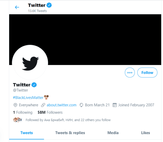 Američki gigant društvenih mreža Tviter promenio je profilnu fotografiju na zvaničnom nalogu, dodajući svojoj biografiji hešteg #BlackLivesMatter.