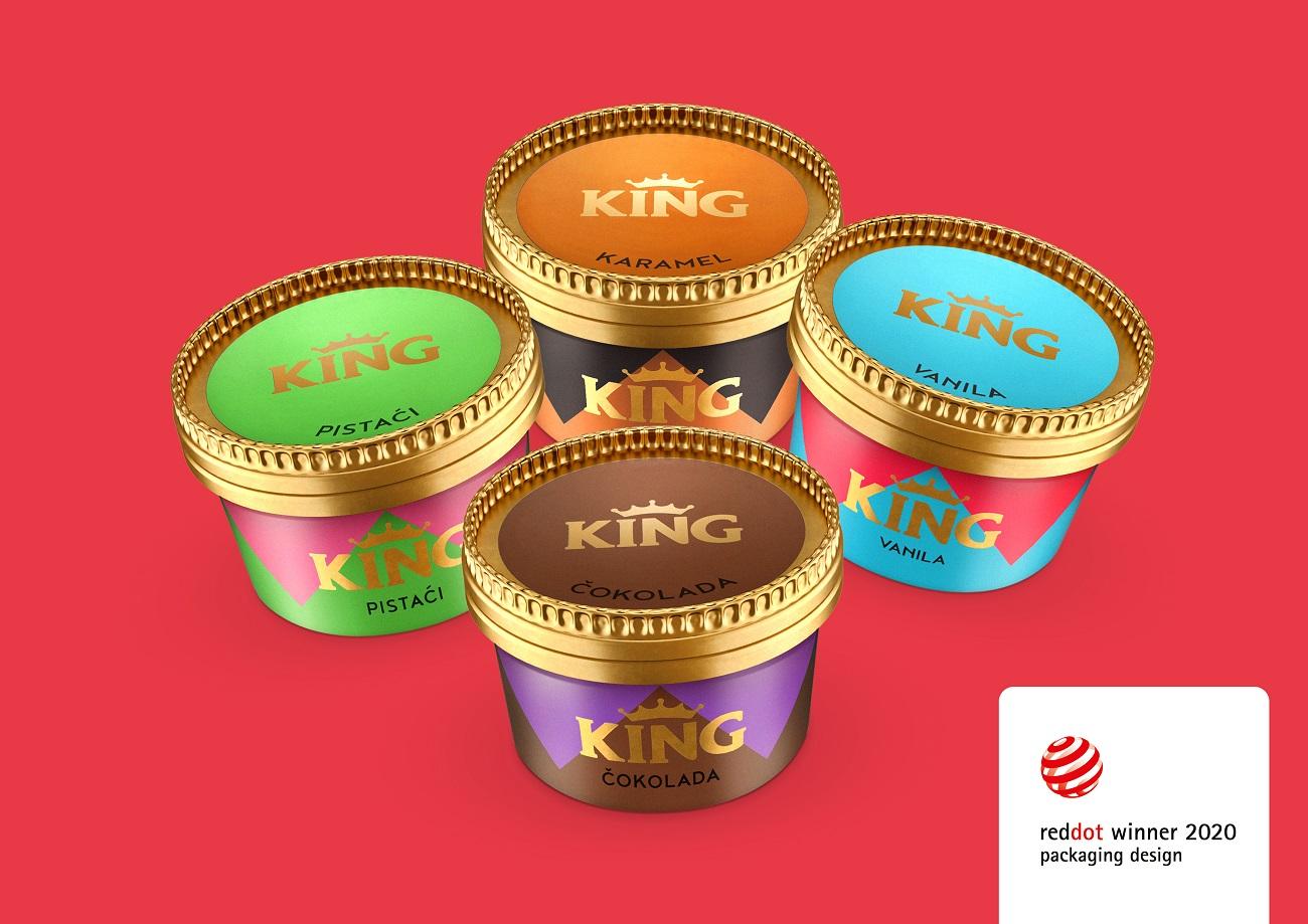 Budući da je King brend svoj portfolio proširio i na druge forme, omiljeni sladoled dobio je potpuno inovativan dizajn za proizvod King dezert u čašici. Kao inspiracija korišćen je stilizovani oblik krune koji simbolično prikazuje kako se konzumiranje King-a pretvara u kraljevski trenutak. Promena formata brenda King zahtevala je upečatljiv, razigran i savremen dizajn. Sa promenom forme, došli su i novi ukusi, pa je neodoljivi kraljevski užitak sada dostupan u četiri ukusa dezerta u čašici: pistaći, karamela, vanila i čokolada.