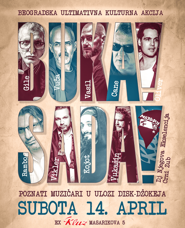 BUKA! (Beogradska Ultimativna Kulturna Akcija) u subotu, 14. aprila,u zgradi bivšeg “Kluza” (Masarikova 5 u potkrovlju) pravi žurku gde će se za gramofonima smenjivati poznati rok muzičari.