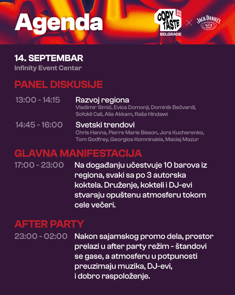 Beograd ovog vikenda postaje centar svetske i regionalne barske kulture. COPY TASTE, 14. i 15. septembra, donosi dvodnevni festival koktela i žurki koji spaja najpoznatija imena svetske scene i lokalne barove. Agenda je objavljena, karte su u prodaji, a sve informacije dostupne su na sajtu festivala.