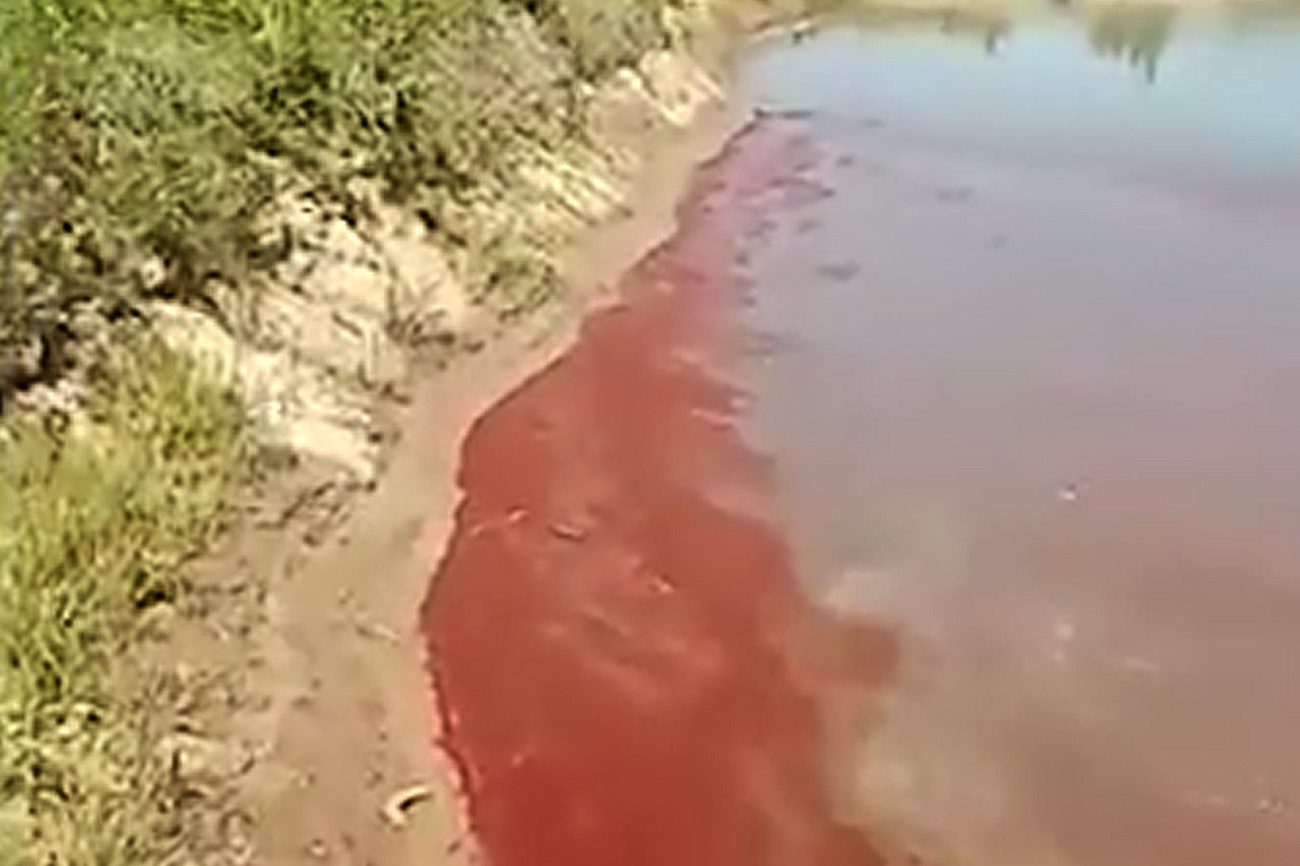 Ispitajte crvenu supstancu u toj bari sta je pa cete znati da je najverovatnije neki lokalni nomad obojio slucajno ili namerno ne bi li dospeo malo u javnost i u novine.