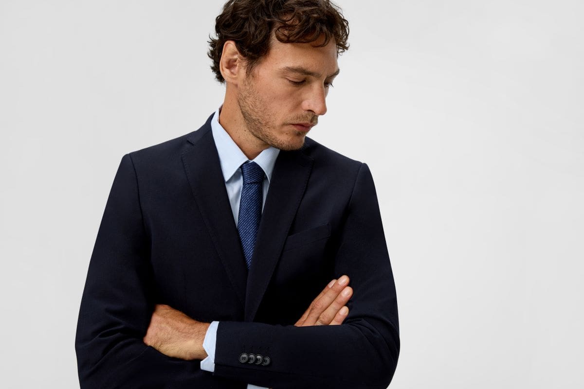 Tamnoplavi sako, tamnoplave pantalone, svetloplava košulja, kravata u nijansi plave, tamnobraon (konjak) kaiš i elegantne tamnobraon (konjak) cipele – jednostavno i veoma elegantno. Ne možete pogrešiti sa ovom kombinacijom.