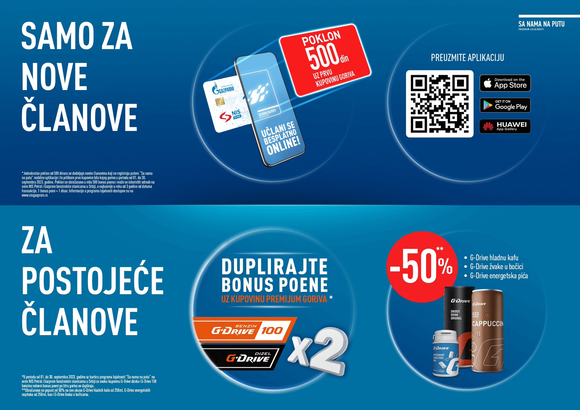 Naime, svi potrošači koji se učlane besplatno u program lojalnosti „Sa nama na putu“ putem mobilne aplikacije, dobijaju po 500 dinara uz prvu kupovinu goriva do 30. septembra. Aktuelni članovi kupovinom premijum G-Drive dizel i G-Drive 100 benzina dobijaju duple bonus poene, kao i 50 odsto popusta na ledenu kafu, žvake i energetska pića u G-Drive brendu.