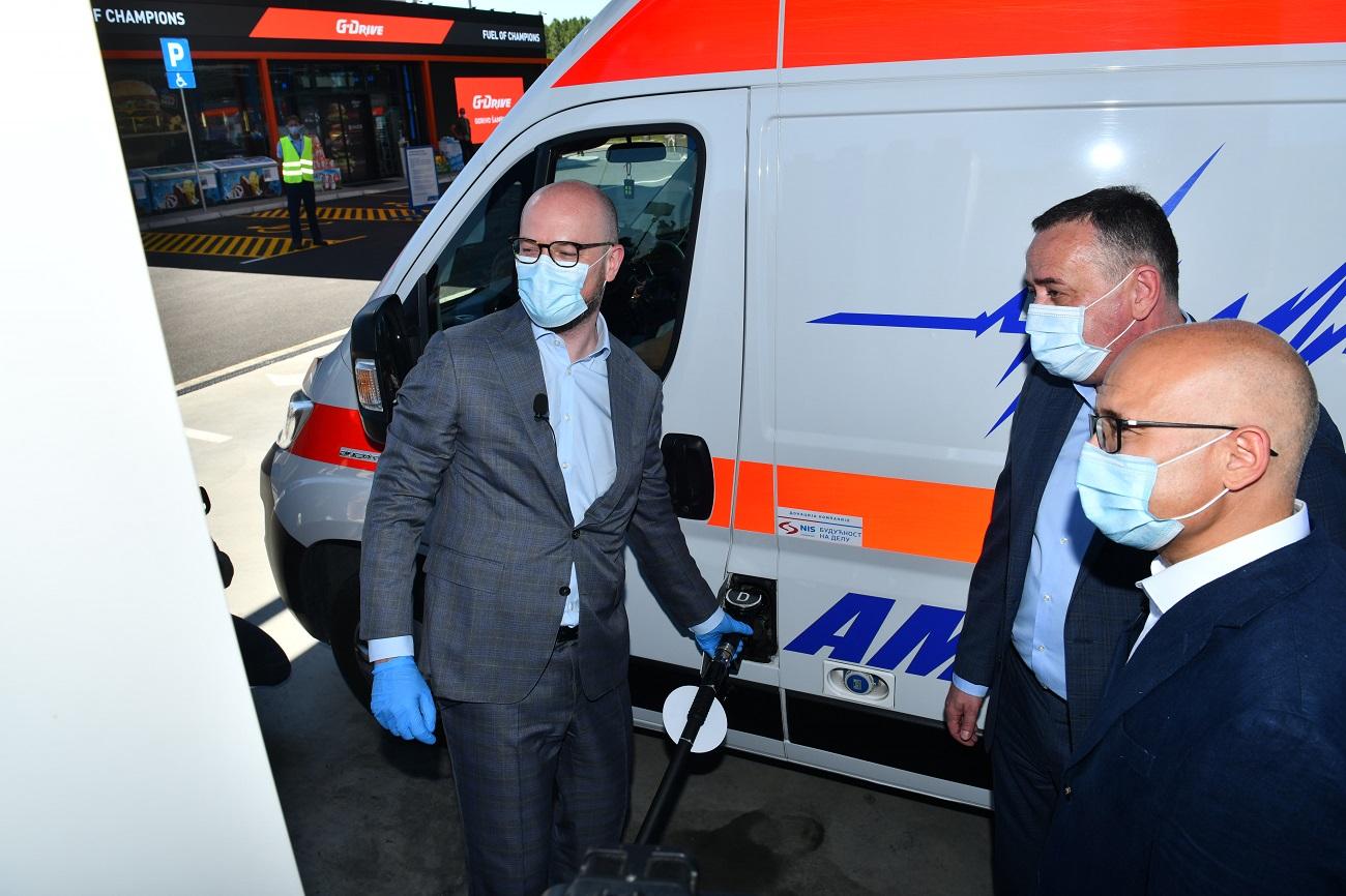 U okviru posete benzinskoj stanici generalni direktor NIS-a, Кiril Tjurdenjev, sipao je gorivo u vozilo Hitne pomoći Novog Sada kao donaciju NIS-a, dok je ministar rudarstva i energetike Aleksandar Antić priključio električni automobil na punjač.
