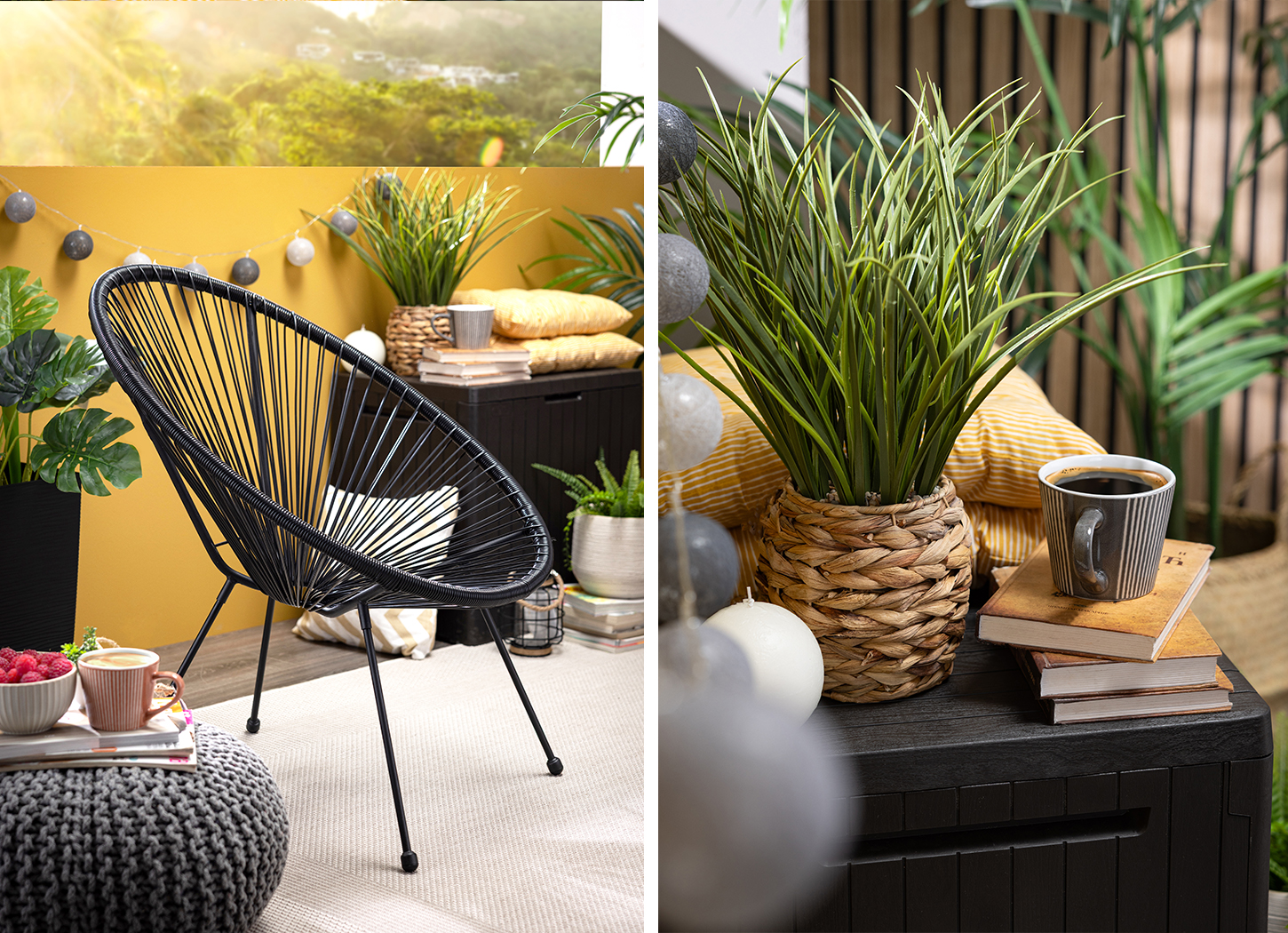 U centru pažnje, nalazi se elegantna ljuljaška PILOW. Pored svog atraktivnog izgleda, ona će terasi pružiti i neverovatnu udobnost. Sa crnom metalnom konstrukcijom, sedištem od crnog PE ratana i jastucima u sivoj nijansi, savršeno se uklapa u moderan, ali i prirodni ambijent. Kako biste uštedeli na prostoru, ali i kako bi vam terasa uvek bila uredna, CITY kutija za odlaganje će vam značiti za sve stvari koje ne koristite svakodnevno (poput jastuka za stolice ili prekrivača SUMMER za svežije večeri). Uz sređen enterijer trenuci provedeni u ljuljašci mogu postati mali ritual odmora: ispijanje jutarnje kafe iz omiljene šolje, popodnevna dremka ili večernje uživanje uz muziku – izbor je na vama.