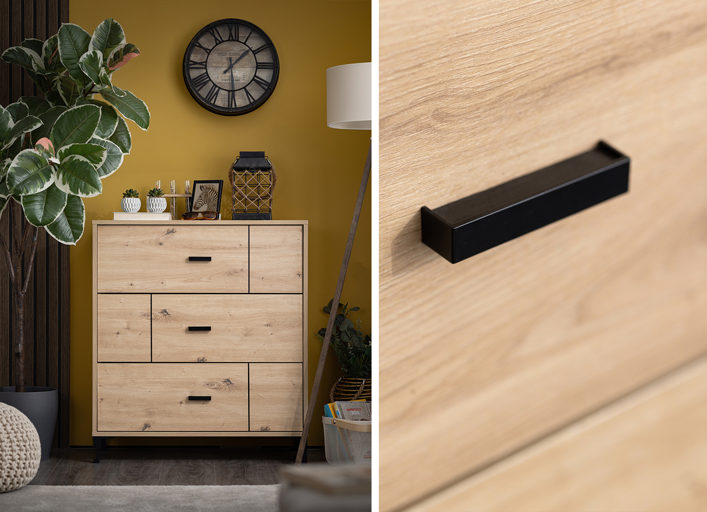 Komoda ALERIA 80 3F u dekoru artisan hrasta sa printom savršeno kombinuje funkcionalnost i moderan dizajn. Njena elegantna estetika ističe se kroz crne pruge na drvenom dekoru, kao i usklađene crne ručke i nogare, što unosi savremen šarm u enterijer. Ima tri prostrane fioke koje pružaju dovoljno mesta za organizaciju, čineći je izuzetno praktičnim komadom nameštaja.