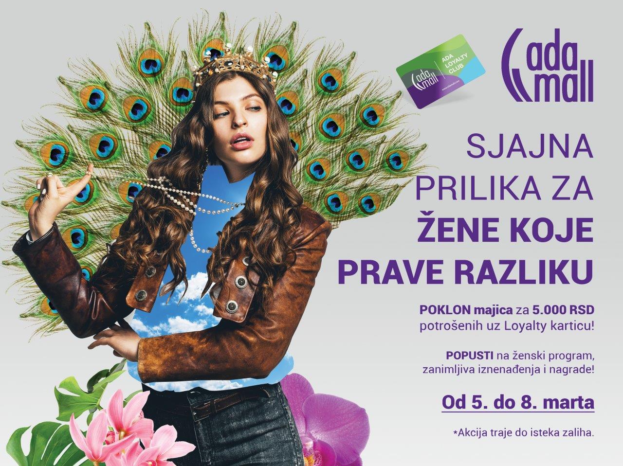 U Ada Mall-u, od 5. do 8. marta tim povodom vas očekuju specijalni popusti na kupovinu artikala iz ženskog programa, dok za kupovine preko 5,000 RSD uz loyalty karticu na poklon dobijate brendiranu majicu.
