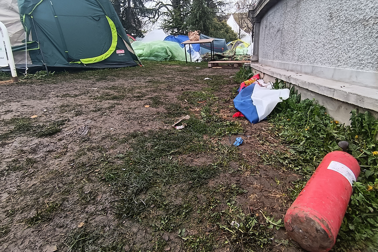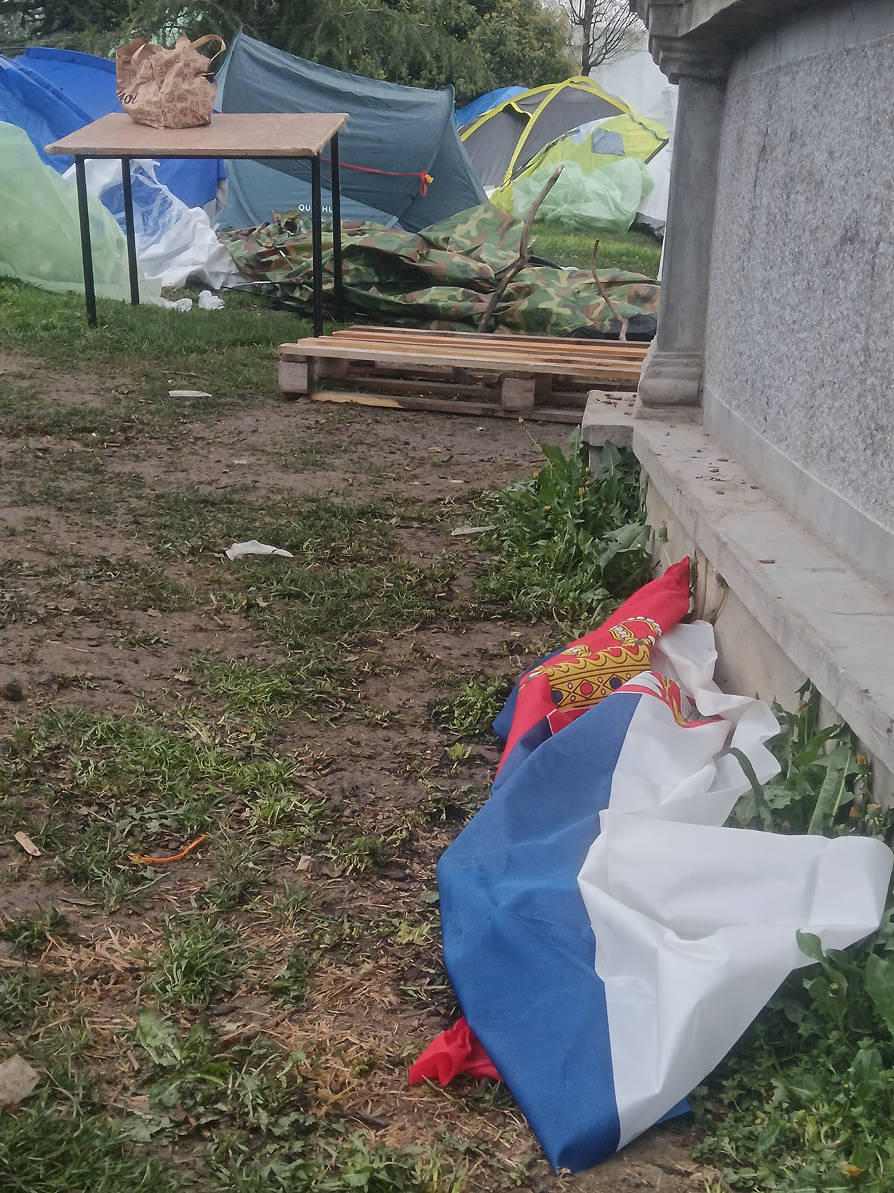 Na ulazu u kamp, uz sav razbacan inventar, „leži“ očigledno bačena srpska zastava koja je sve ove dane „krasila“ šatore „vrednih“ studenata koji su „samo želeli da uče“.