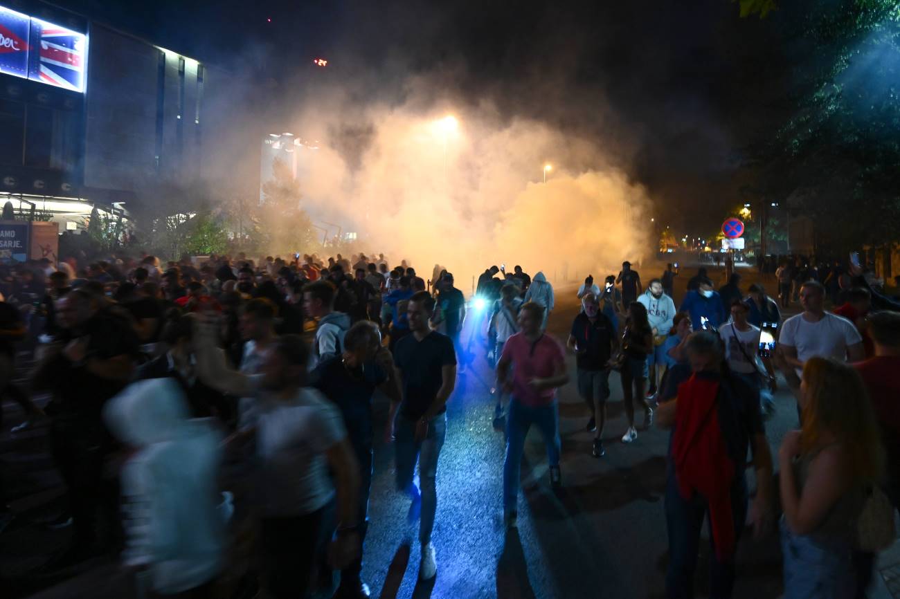 Prisutni su zatim zapalili navijačke baklje i počeli da ih bacaju na parlament, a policija je odgovorila suzavcem i rasturila grupu.