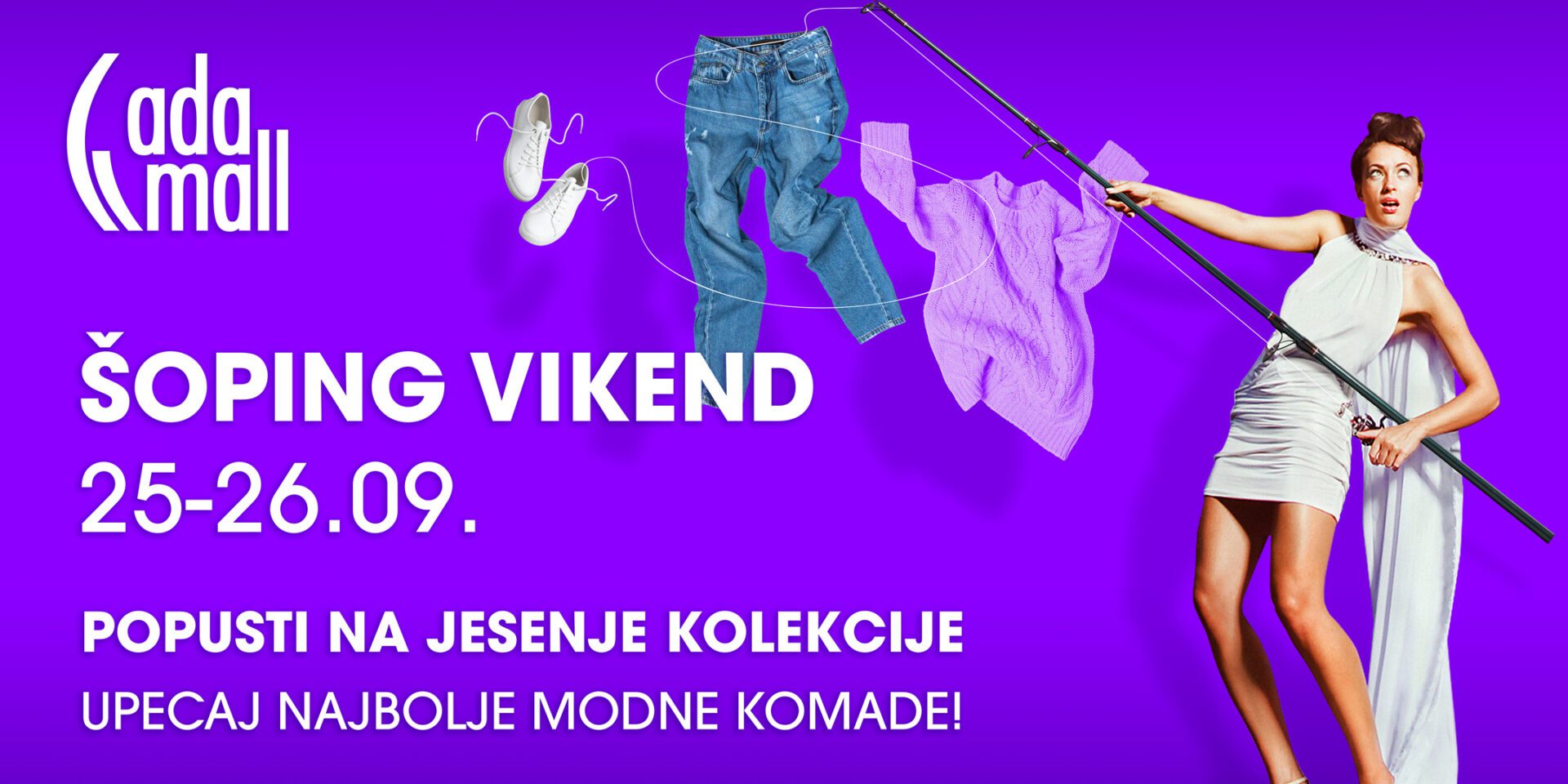 Septembar je mesec novih početaka. ADA MALL na početku modne sezone sprema posebnu poslasticu. Od 25. do 26. septembra počinje sezona lova na nove komade, specijalni Šoping vikendom u okviru kojeg ćete najatraktinije modele odeće, obuće i aksesoara za nju i njega, ali i dečijeg programa kupitu po specijalnim popustima do 50%. Dodatni popusti na letnje kolekcije i popusti na nove čekaju na vas.