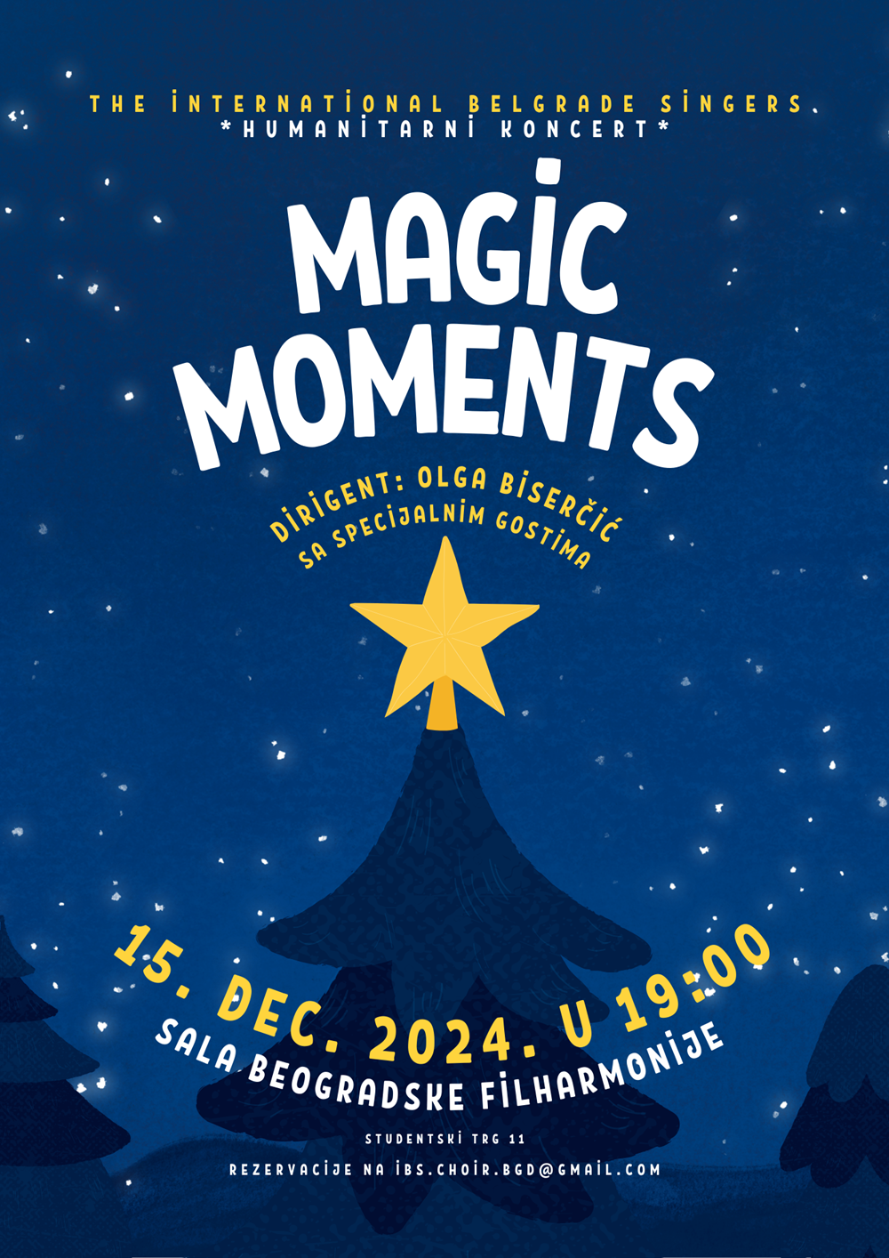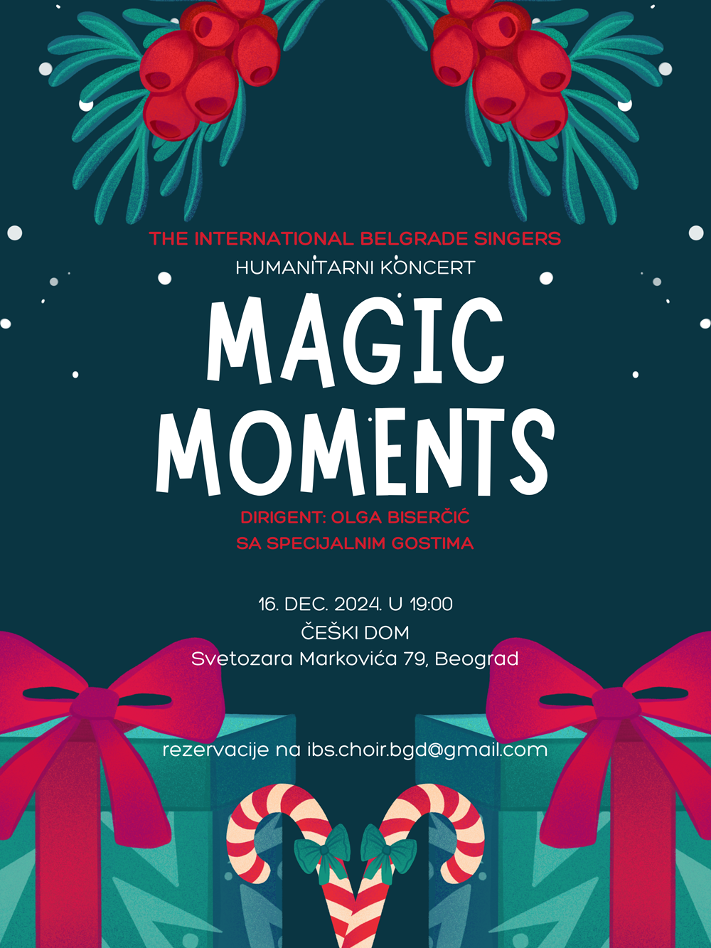 Humanitarni božićni koncerti hora „The International Belgrade Singers“ održaće se pod nazivom „Magic Moments“ u nedelju, 15. decembar 2024. u 19:00, (Sala Beogradske filharmonije, Studentski trg 11), i u ponedeljak, 16. decembar 2024. u 19:00, (Češki dom, Svetozara Markovića 79).