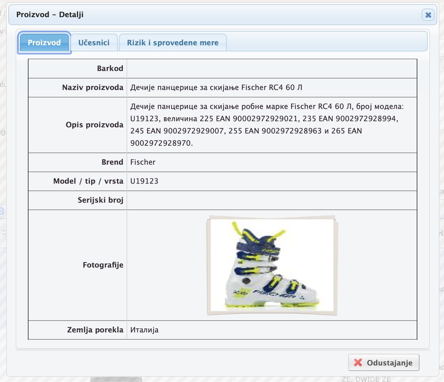 U pitanju je broj modela: U19123, veličina 225 EAN 90002972929021, 235 EAN 9002972928994, 245 EAN 9002972929007, 255 EAN 9002972928963 и 265 EAN 9002972928970.