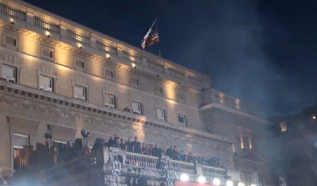 Igrači i članovi stručnog štaba su pojedinačno izlazili na balkon, uz ovacije okupljenih koji su mahali državnim zastavama i palili pirotehniku.