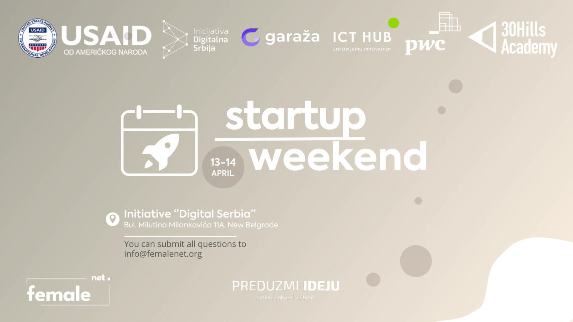 Zahvaljujući našim sjajnim partnerima, Startap Vikend će biti iskustvo koje ćete dugo pamtiti! Ovo izdanje Startap Vikenda u Beogradu organizuju Female Net u saradnji sa partnerskim organizacijama iz inovacionog ekosistema Srbije: USAID Srbija, Inicijativa Digitalna Srbija, Garaža by Tenderly, ICT Hub, PwC,30 Hills Academy i Preduzmi ideju.