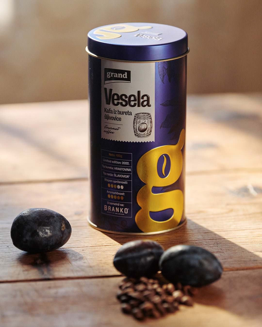 Grand Vesela – kafa iz bureta šljivovice, predstavlja inovaciju u kategoriji kafe i donosi autentično kafeno iskustvo sa karakterom našeg naroda! Prava domaća kafa kakva ne postoji nigde u svetu spaja dva omiljena rituala karakteristična za naše podneblje – ispijanje kafe i degustiranje rakije, u proizvod jedinstvene arome i autentičnog ukusa.