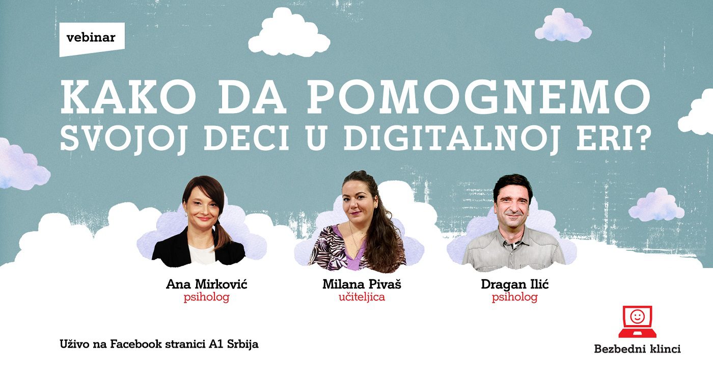 Učesnici ovog vebinara, koji se organizuje u okviru A1 edukativne platforme „Bezbedni klinci“, potrudiće se da korisnim i edukativnim sadržajima pomognu roditeljima i motivišu ih da konstruktivnije razgovaraju sa decom o različitim temama koje spadaju u domen digitalne pismenosti. Razgovor će voditi psiholozi Ana Mirković i Dragan Ilić, kao i učiteljica Milana Pivaš, sa ciljem da daju odgovore na brojna pitanja svima onima čija deca aktivno koriste internet i koji žele više da se informišu o izazovima digitalne ere i mnogobrojnim promenama koje su zatekle đake, roditelje i čitav obrazovni sistem.